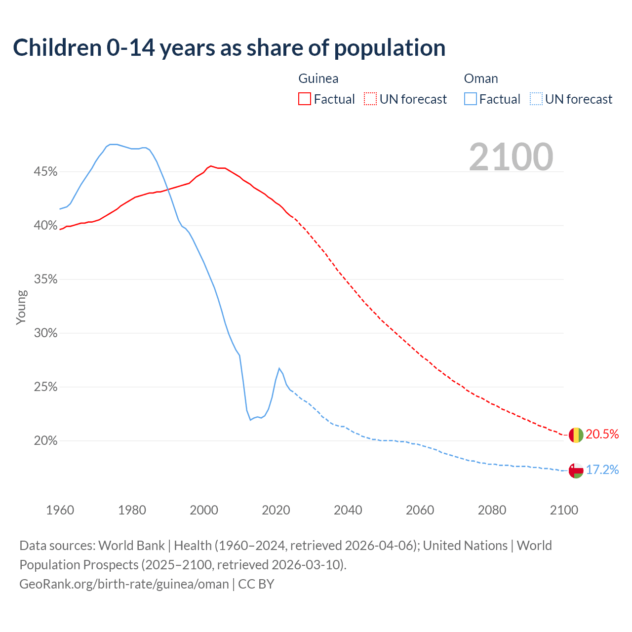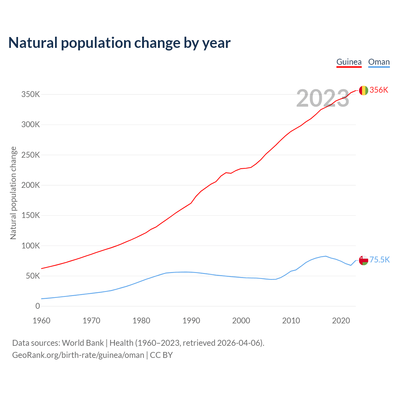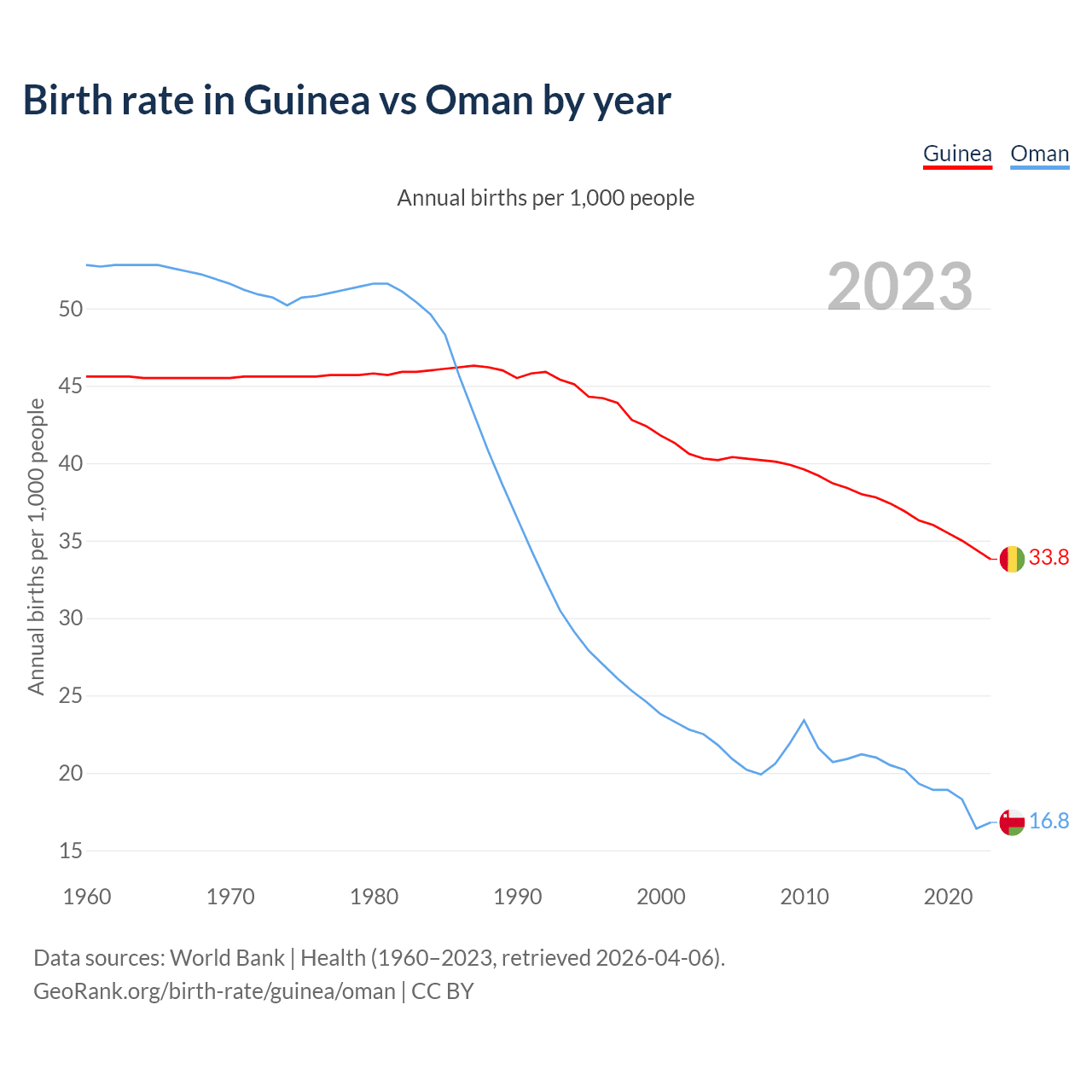 Guinea has an annual birth rate of 33.8 births per 1,000 people, compared to 16.8 for Oman. The average number of children a woman is expected to have during her lifetime — the fertility rate, is 4.22 in Guinea and 2.53 in Oman — 40.1% difference.