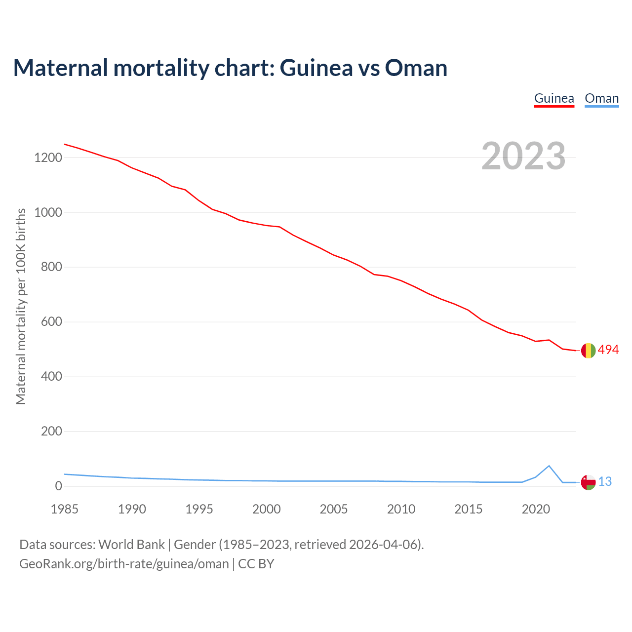 The maternal mortality rate, which is the probability of dying during childbirth or within 42 days of pregnancy termination, is 494 deaths per 100,000 live births in Guinea, compared to 13 deaths in Oman.