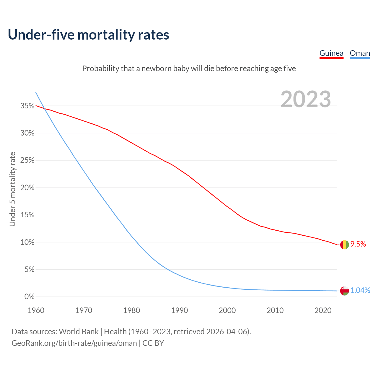 The chance that a newborn baby will die before reaching age five is 9.5% in Guinea and 1.04% in Oman. Above is a chart with historical data on under-five mortality rates.