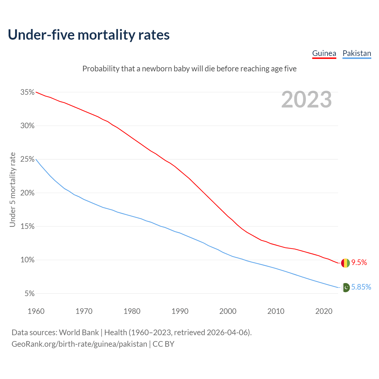 The chance that a newborn baby will die before reaching age five is 9.5% in Guinea and 5.85% in Pakistan. Above is a chart with historical data on under-five mortality rates.