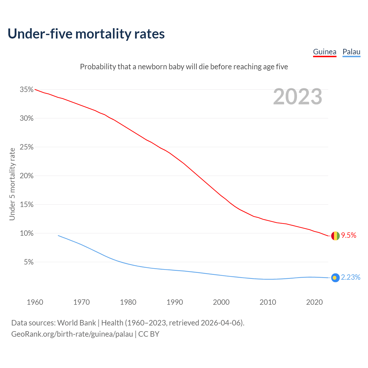 The chance that a newborn baby will die before reaching age five is 9.5% in Guinea and 2.23% in Palau. Above is a chart with historical data on under-five mortality rates.