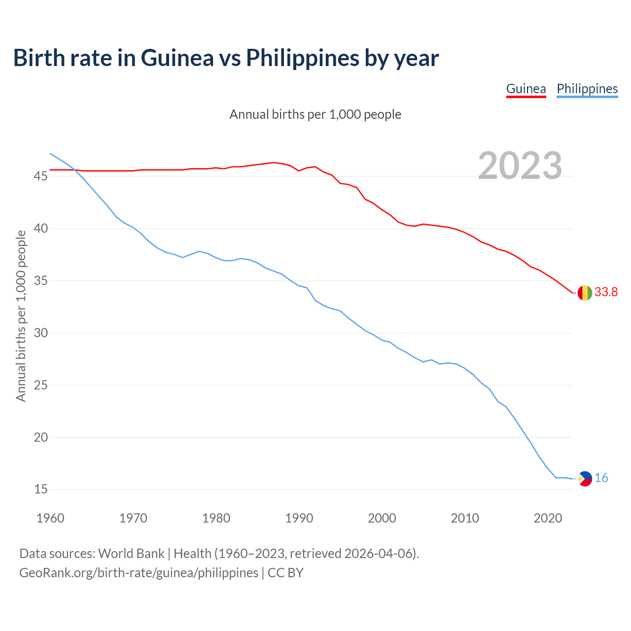 Guinea has an annual birth rate of 33.8 births per 1,000 people, compared to 16 for the Philippines. The average number of children a woman is expected to have during her lifetime — the fertility rate, is 4.22 in Guinea and 1.92 in the Philippines — 54.6% difference.