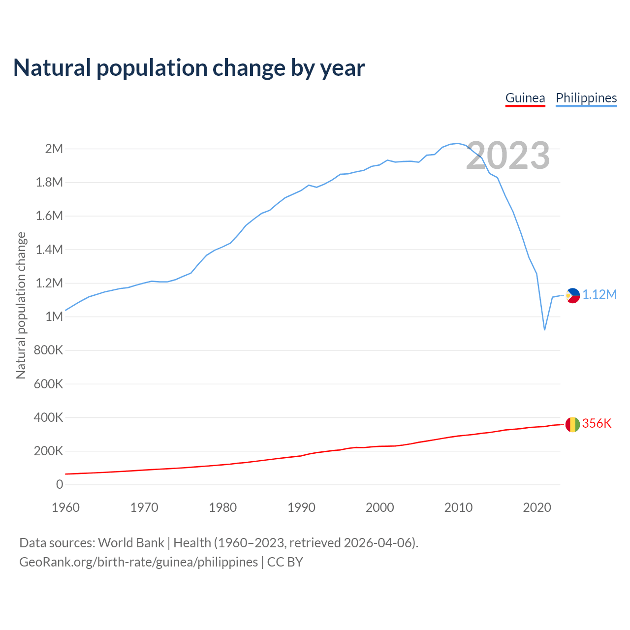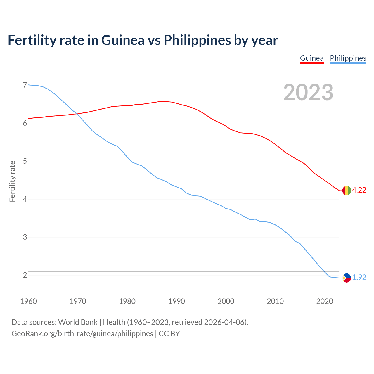 According to the latest available data on birth rates, the fertility rate in Guinea was 4.22 children per woman in 2023, compared to 1.92 in the Philippines in 2023. The replacement level is considered to be 2.1 children per woman.