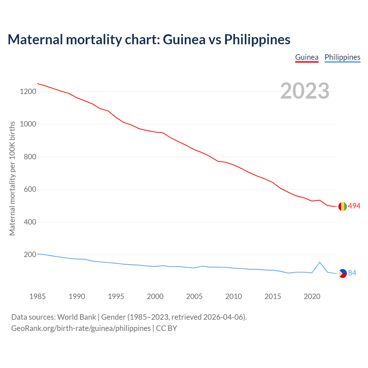 The maternal mortality rate, which is the probability of dying during childbirth or within 42 days of pregnancy termination, is 494 deaths per 100,000 live births in Guinea, compared to 84 deaths in the Philippines.