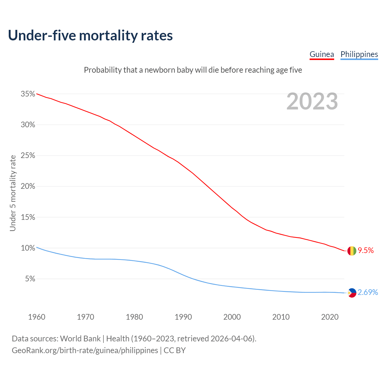 The chance that a newborn baby will die before reaching age five is 9.5% in Guinea and 2.69% in the Philippines. Above is a chart with historical data on under-five mortality rates.