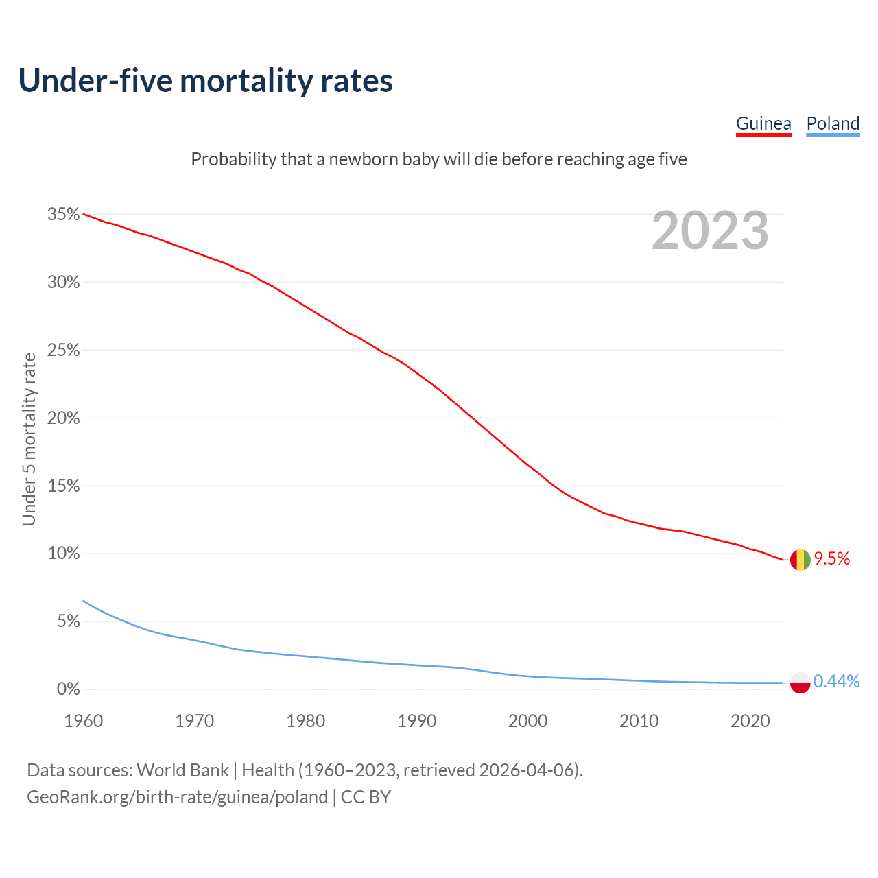 The chance that a newborn baby will die before reaching age five is 9.5% in Guinea and 0.44% in Poland. Above is a chart with historical data on under-five mortality rates.