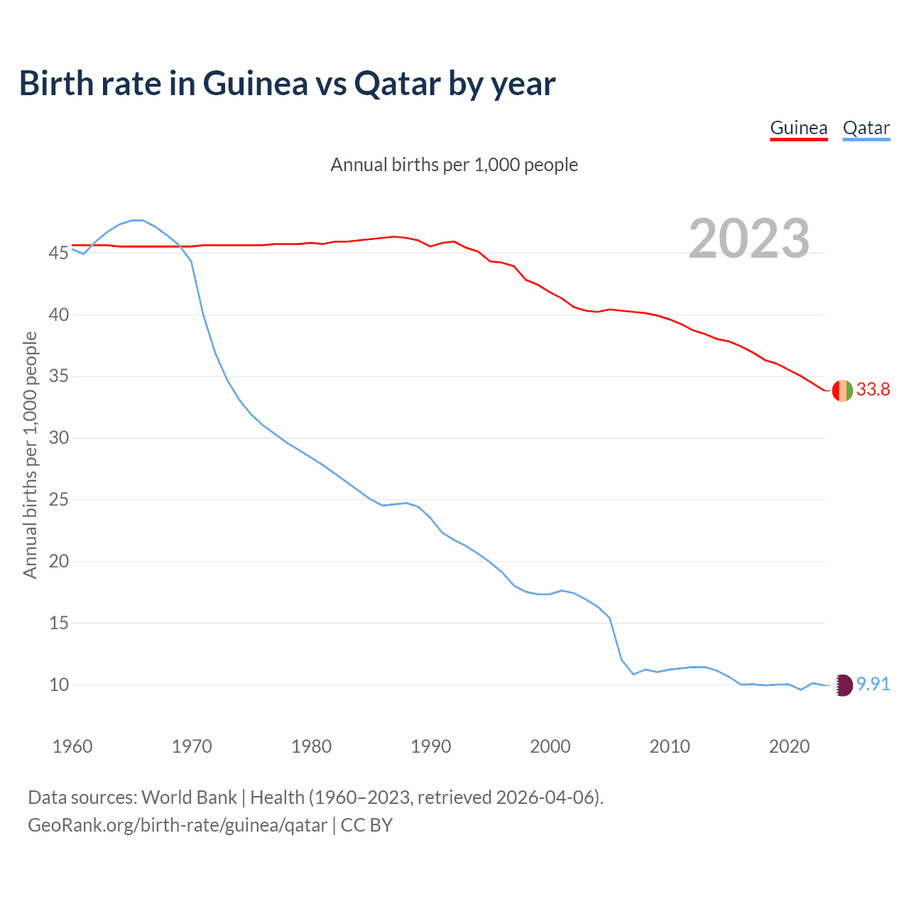 Guinea has an annual birth rate of 33.8 births per 1,000 people, compared to 9.91 for Qatar. The average number of children a woman is expected to have during her lifetime — the fertility rate, is 4.22 in Guinea and 1.73 in Qatar — 59% difference.