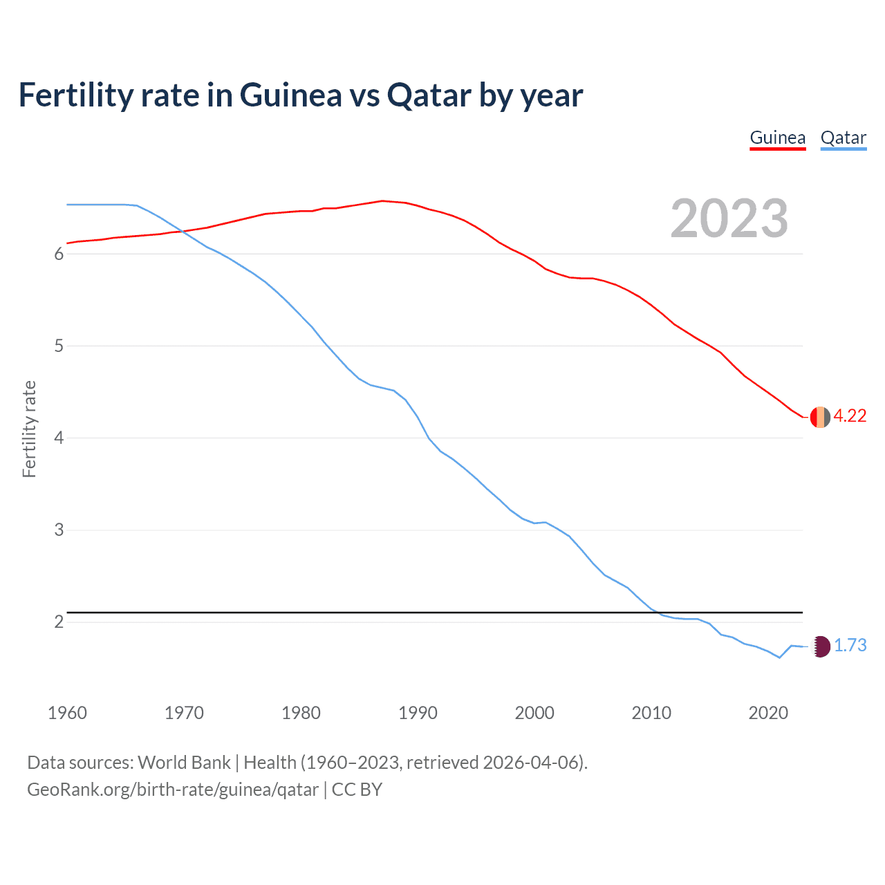 According to the latest available data on birth rates, the fertility rate in Guinea was 4.22 children per woman in 2023, compared to 1.73 in Qatar in 2023. The replacement level is considered to be 2.1 children per woman.