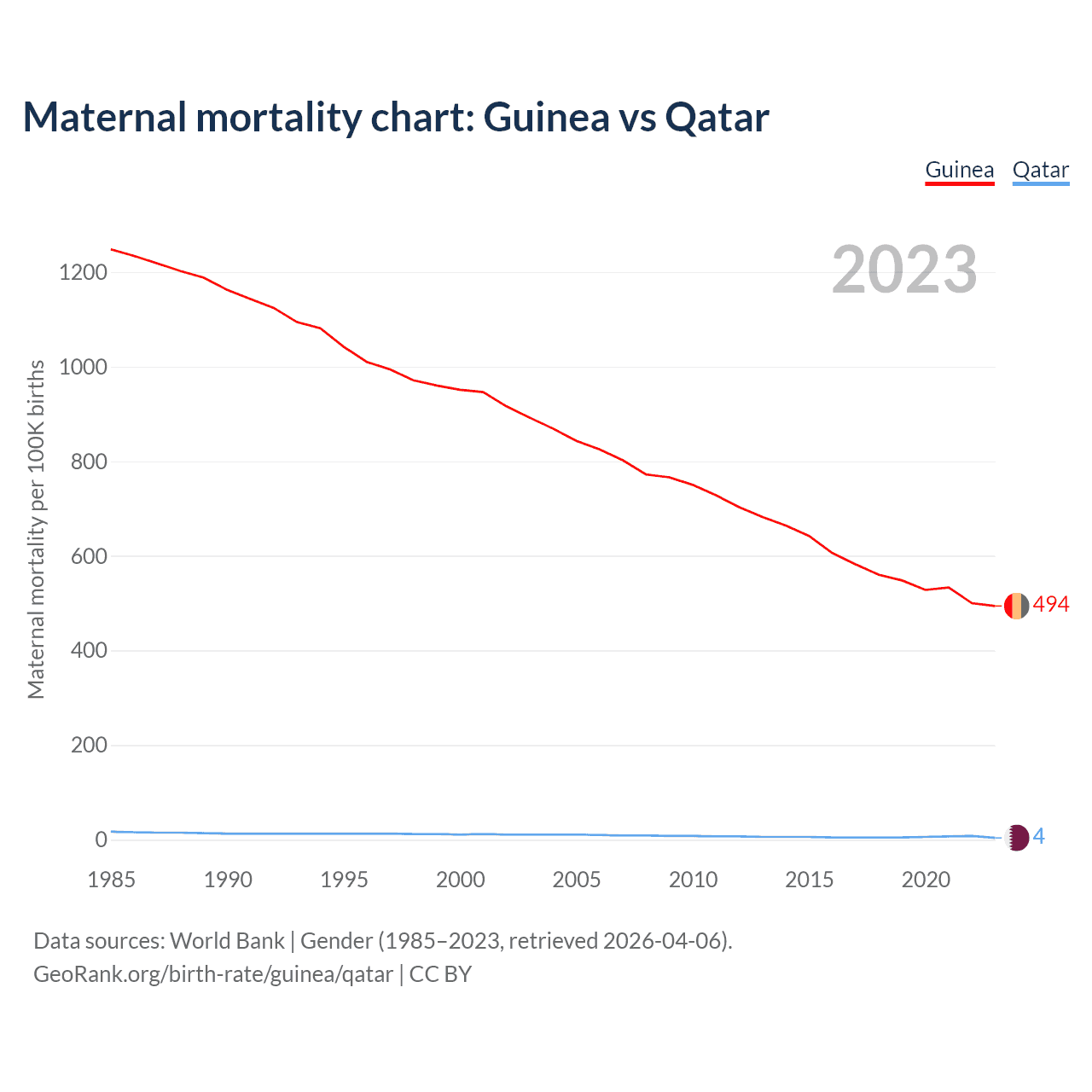 The maternal mortality rate, which is the probability of dying during childbirth or within 42 days of pregnancy termination, is 494 deaths per 100,000 live births in Guinea, compared to 4 deaths in Qatar.