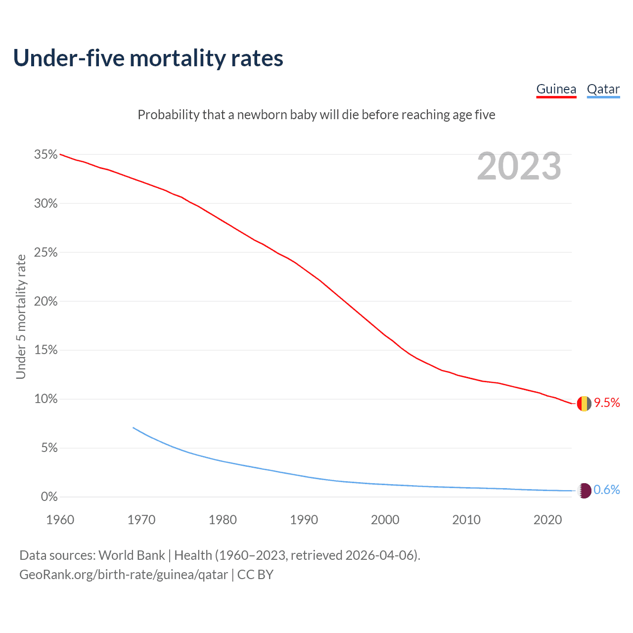 The chance that a newborn baby will die before reaching age five is 9.5% in Guinea and 0.6% in Qatar. Above is a chart with historical data on under-five mortality rates.