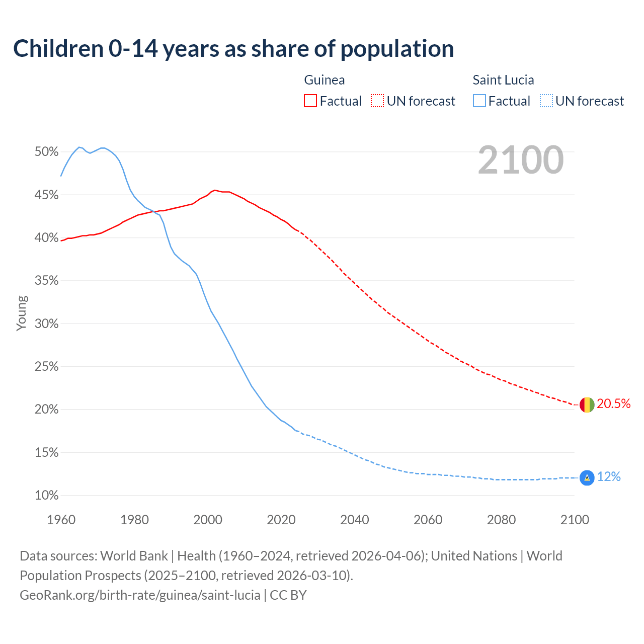 Guinea has an annual birth rate of 33.8 births per 1,000 people, compared to 11.3 for Saint Lucia. The average number of children a woman is expected to have during her lifetime — the fertility rate, is 4.22 in Guinea and 1.38 in Saint Lucia — 67.3% difference.