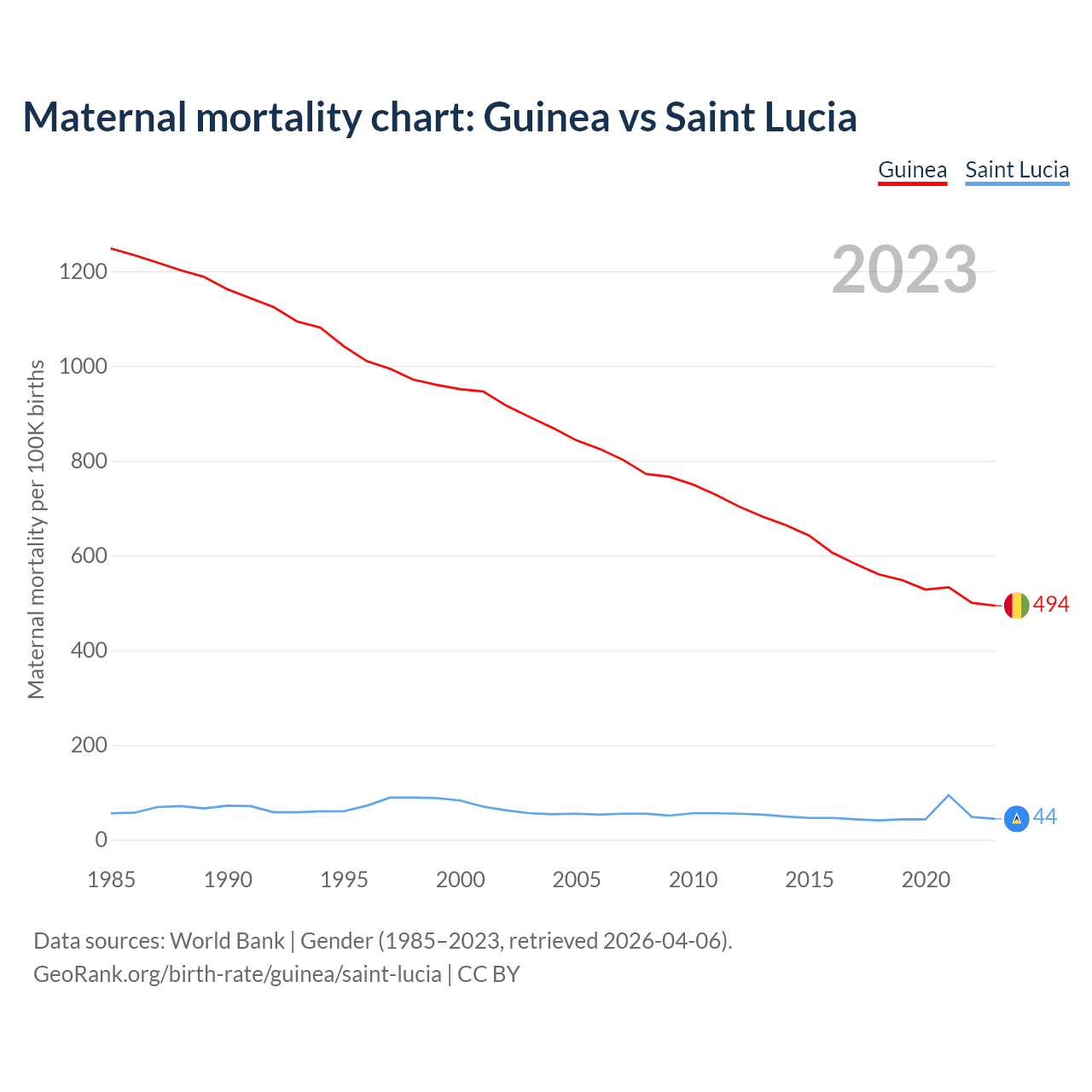 The maternal mortality rate, which is the probability of dying during childbirth or within 42 days of pregnancy termination, is 494 deaths per 100,000 live births in Guinea, compared to 44 deaths in Saint Lucia.