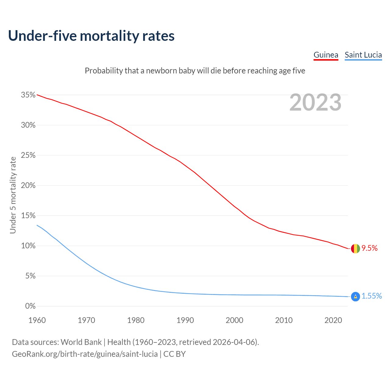 The chance that a newborn baby will die before reaching age five is 9.5% in Guinea and 1.55% in Saint Lucia. Above is a chart with historical data on under-five mortality rates.