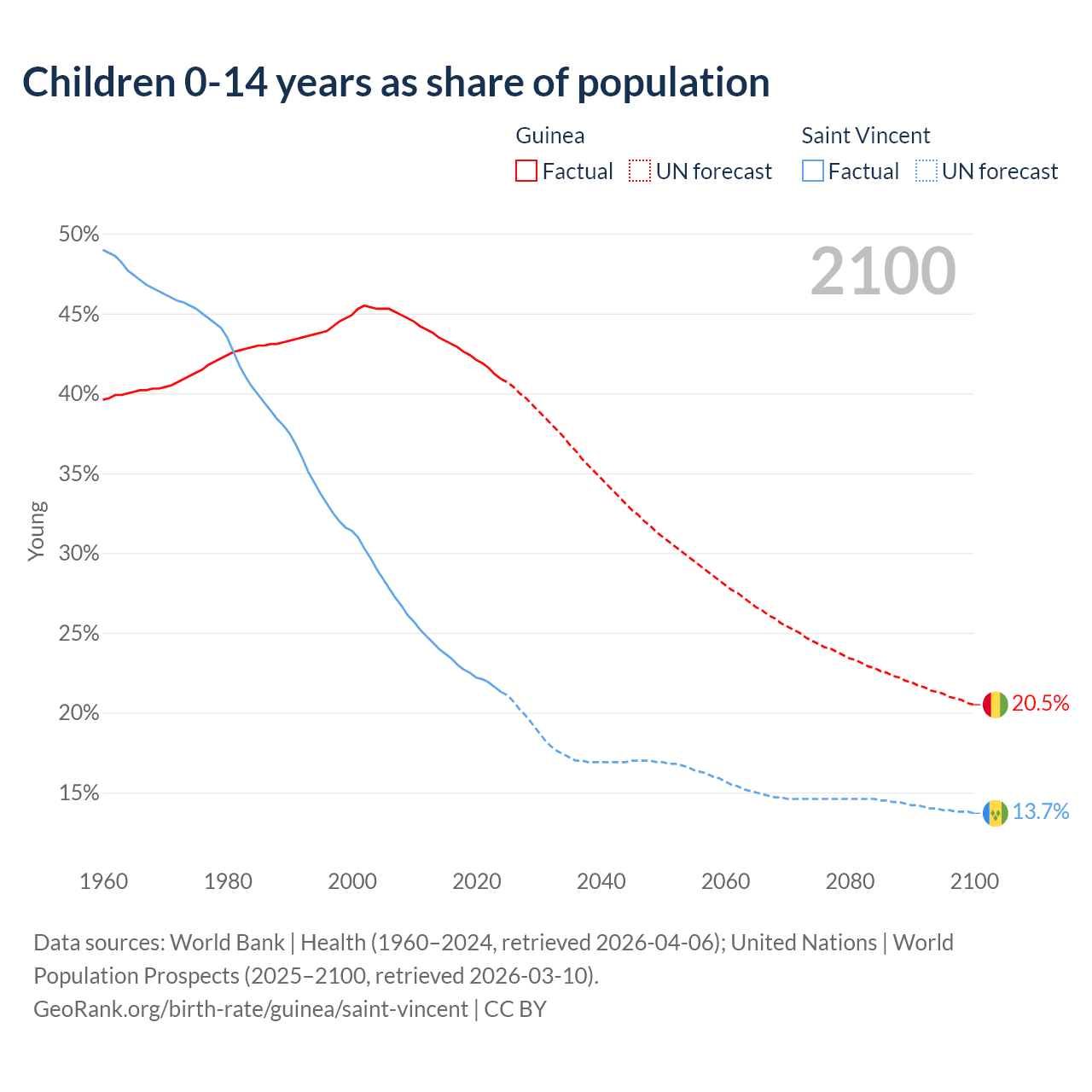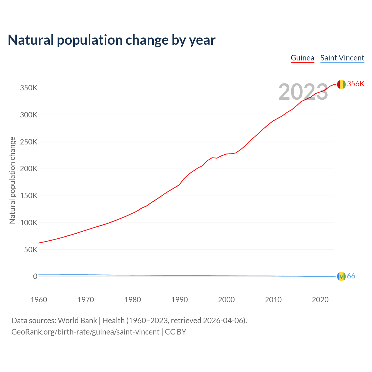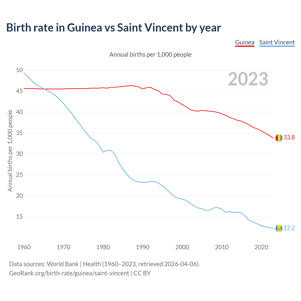Guinea has an annual birth rate of 33.8 births per 1,000 people, compared to 12.2 for Saint Vincent. The average number of children a woman is expected to have during her lifetime — the fertility rate, is 4.22 in Guinea and 1.78 in Saint Vincent — 57.9% difference.