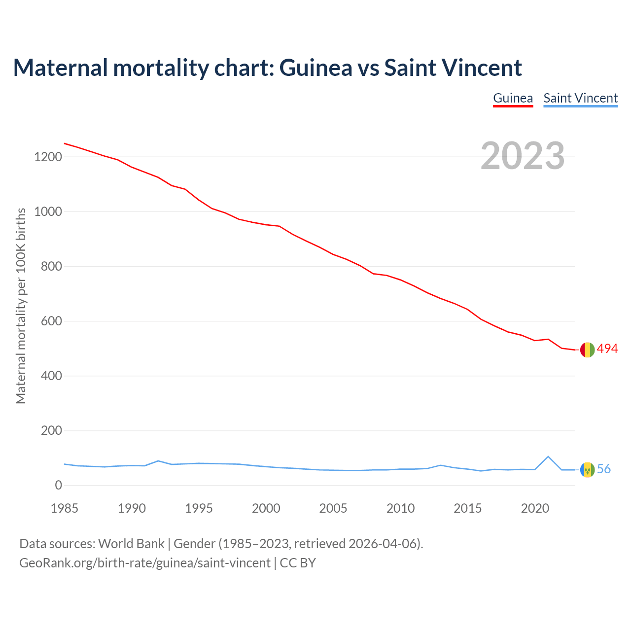The maternal mortality rate, which is the probability of dying during childbirth or within 42 days of pregnancy termination, is 494 deaths per 100,000 live births in Guinea, compared to 56 deaths in Saint Vincent.