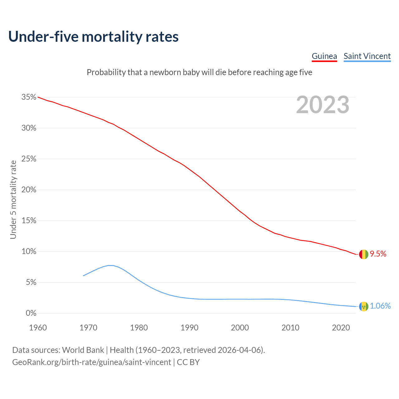 The chance that a newborn baby will die before reaching age five is 9.5% in Guinea and 1.06% in Saint Vincent. Above is a chart with historical data on under-five mortality rates.