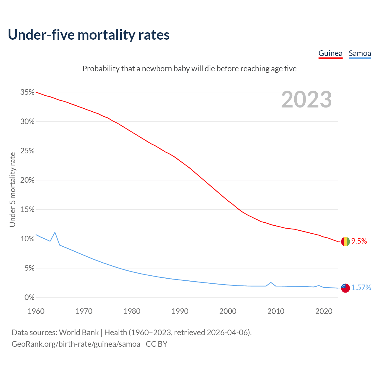The chance that a newborn baby will die before reaching age five is 9.5% in Guinea and 1.57% in Samoa. Above is a chart with historical data on under-five mortality rates.