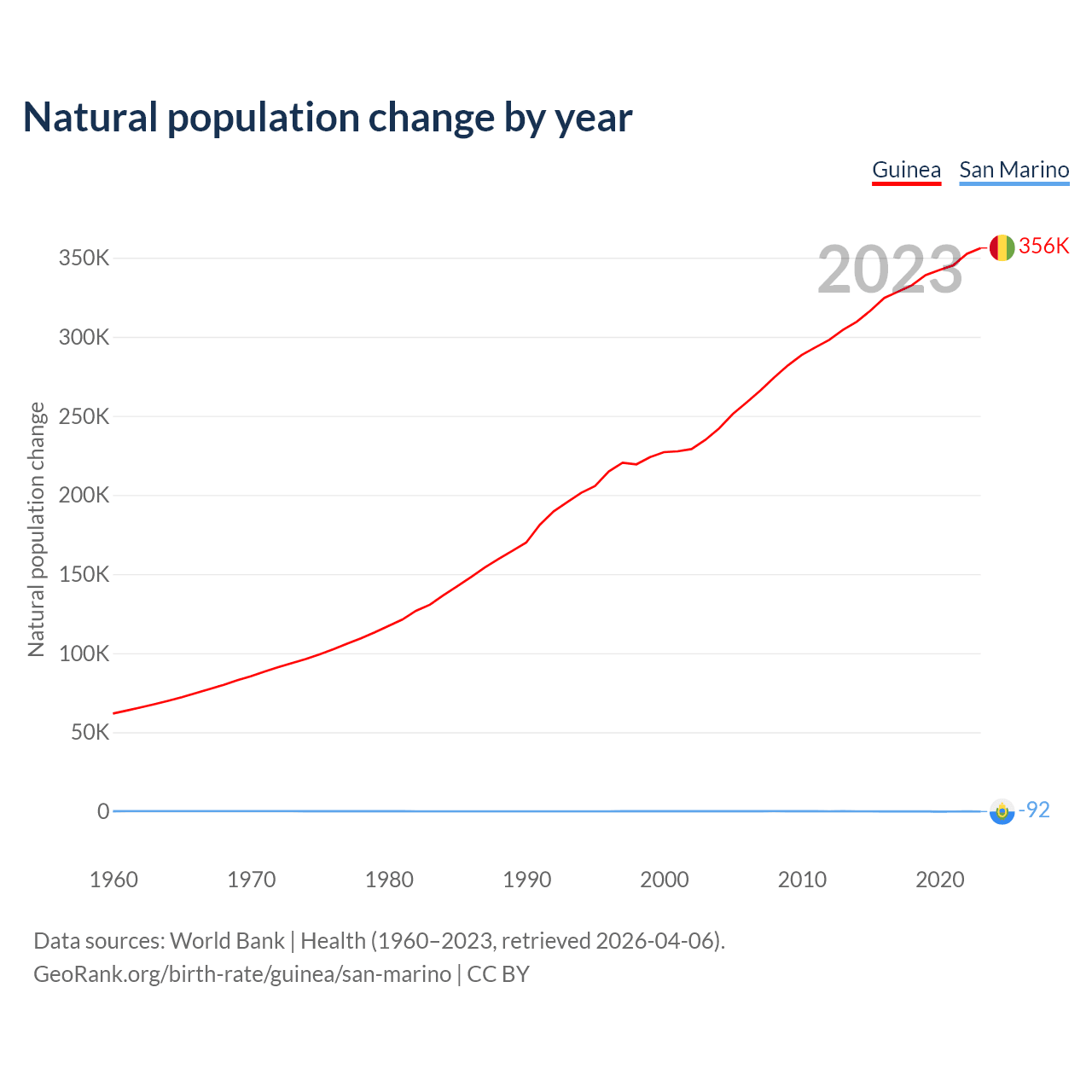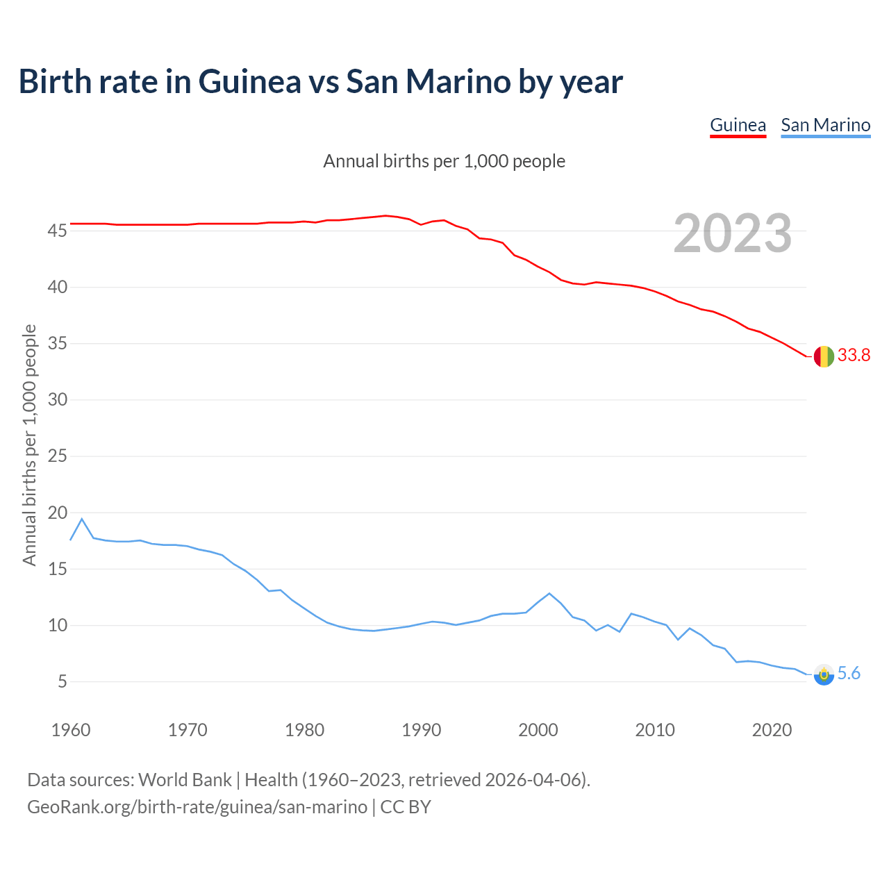 Guinea has an annual birth rate of 33.8 births per 1,000 people, compared to 5.6 for San Marino. The average number of children a woman is expected to have during her lifetime — the fertility rate, is 4.22 in Guinea and 1.15 in San Marino — 72.8% difference.