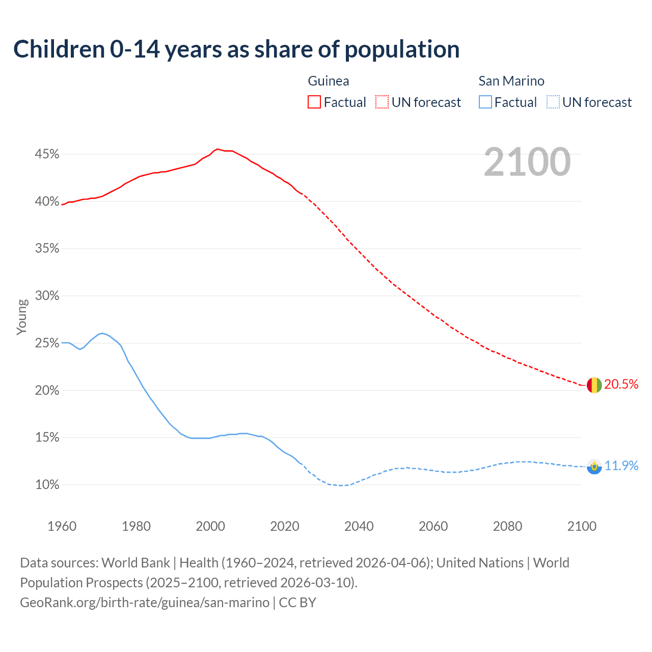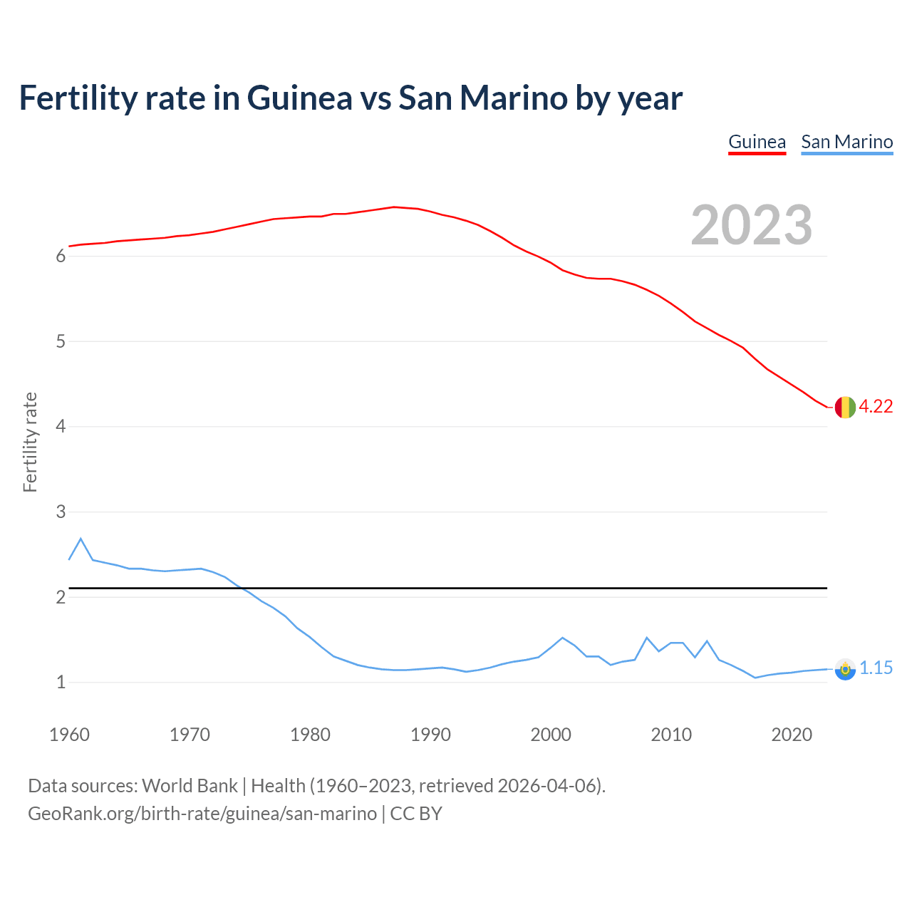 According to the latest available data on birth rates, the fertility rate in Guinea was 4.22 children per woman in 2023, compared to 1.15 in San Marino in 2023. The replacement level is considered to be 2.1 children per woman.
