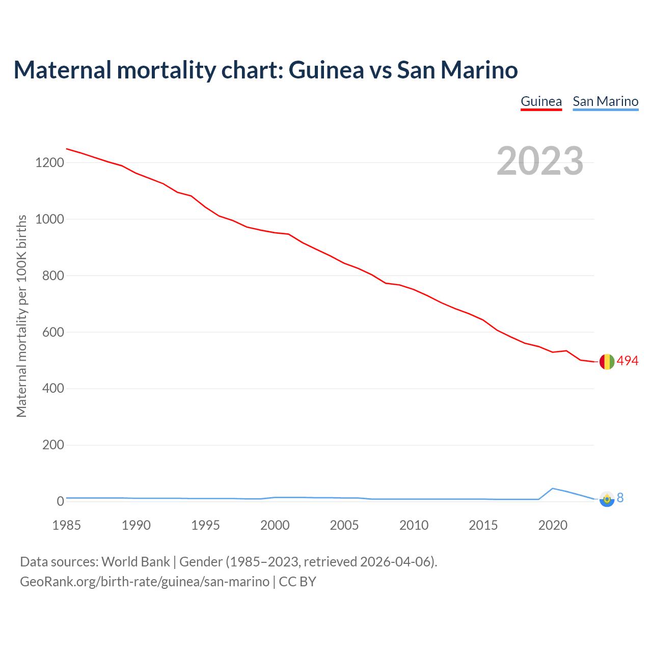 The maternal mortality rate, which is the probability of dying during childbirth or within 42 days of pregnancy termination, is 494 deaths per 100,000 live births in Guinea, compared to 8 deaths in San Marino.