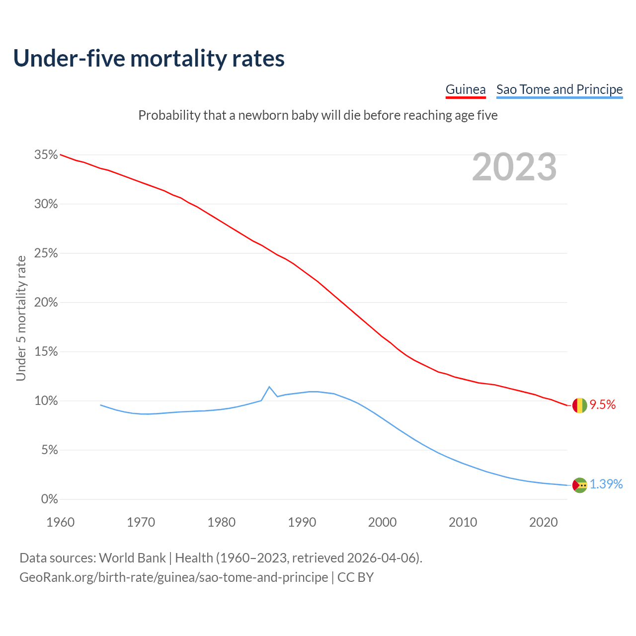 The chance that a newborn baby will die before reaching age five is 9.5% in Guinea and 1.39% in Sao Tome and Principe. Above is a chart with historical data on under-five mortality rates.