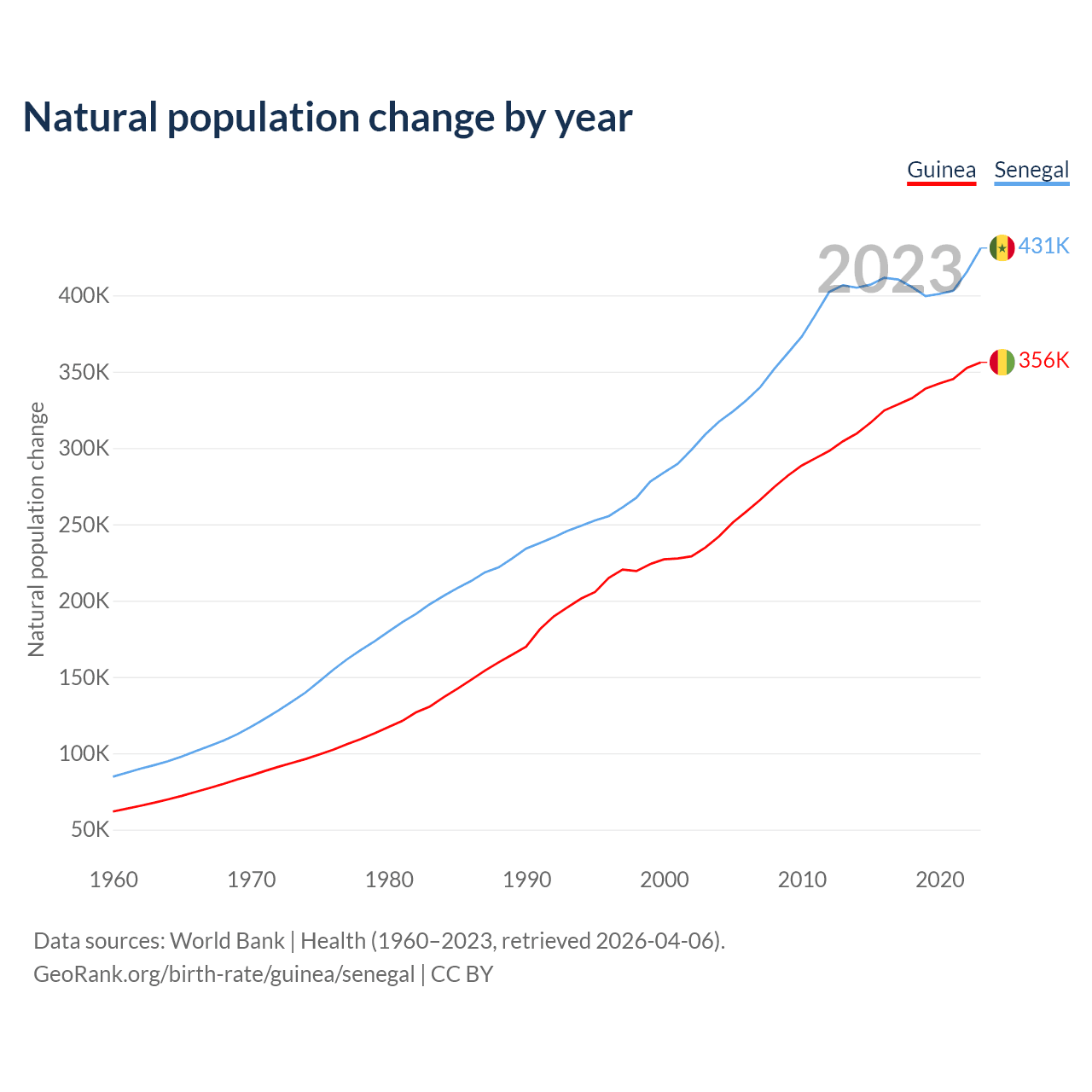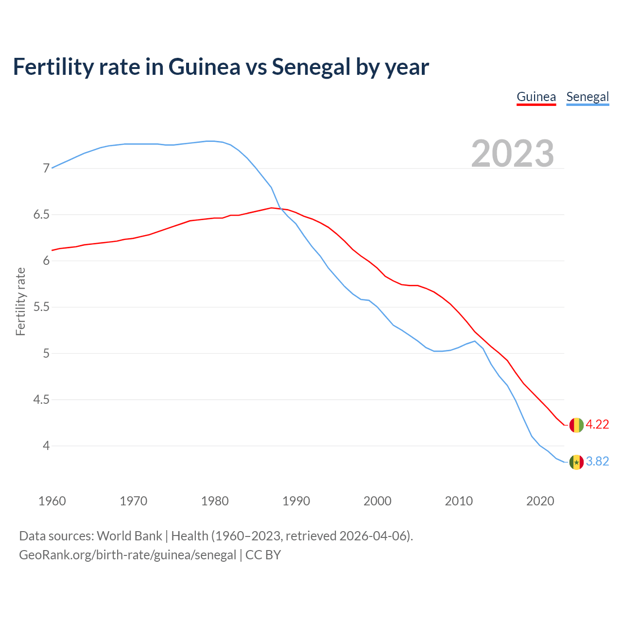 According to the latest available data on birth rates, the fertility rate in Guinea was 4.22 children per woman in 2023, compared to 3.82 in Senegal in 2023. The replacement level is considered to be 2.1 children per woman.