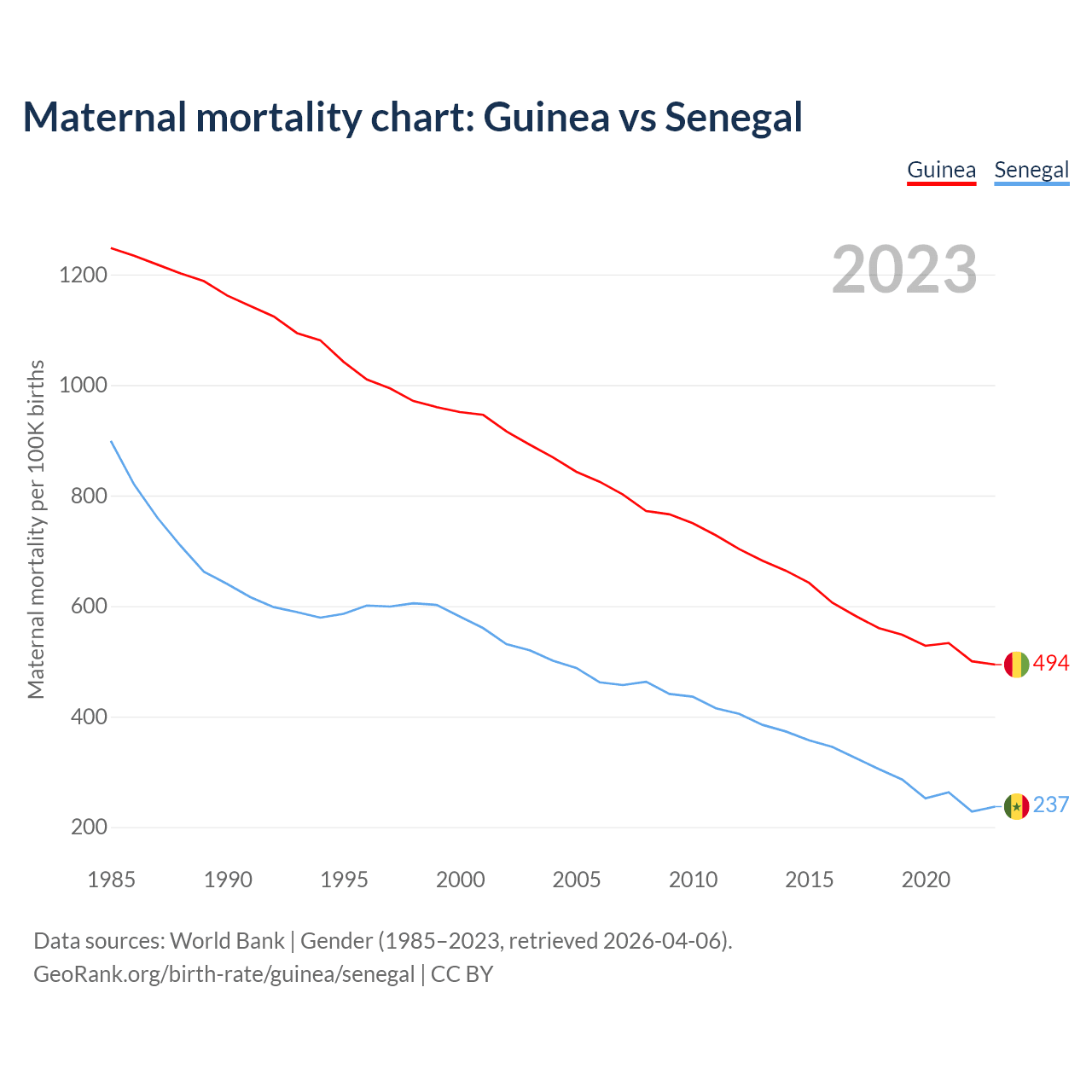 The maternal mortality rate, which is the probability of dying during childbirth or within 42 days of pregnancy termination, is 494 deaths per 100,000 live births in Guinea, compared to 237 deaths in Senegal.