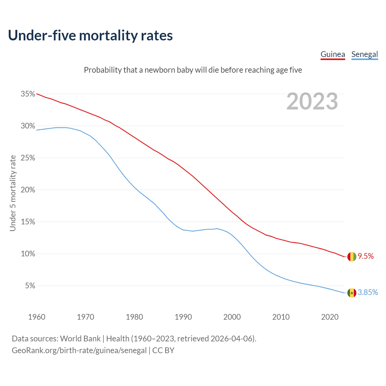 The chance that a newborn baby will die before reaching age five is 9.5% in Guinea and 3.85% in Senegal. Above is a chart with historical data on under-five mortality rates.