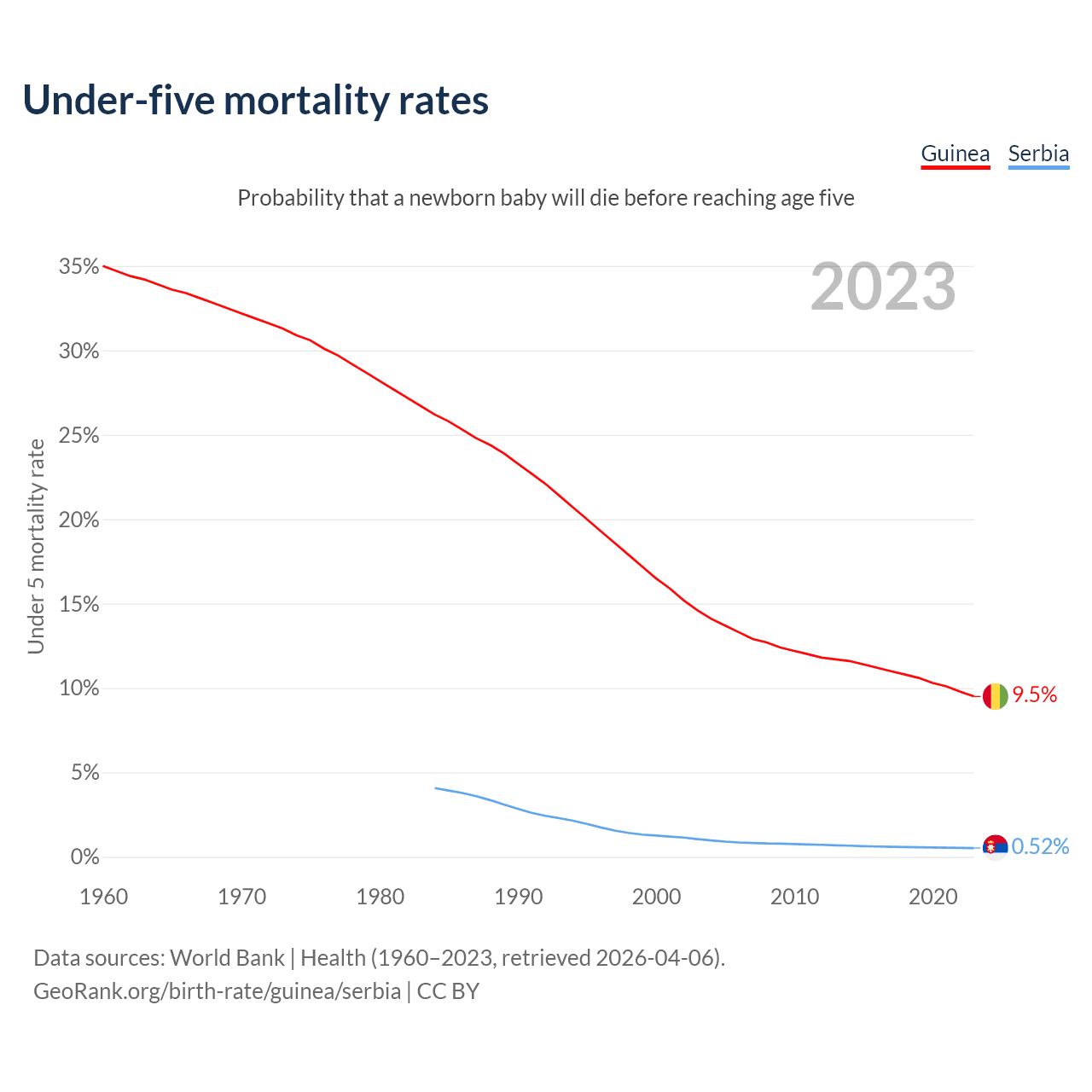 The chance that a newborn baby will die before reaching age five is 9.5% in Guinea and 0.52% in Serbia. Above is a chart with historical data on under-five mortality rates.
