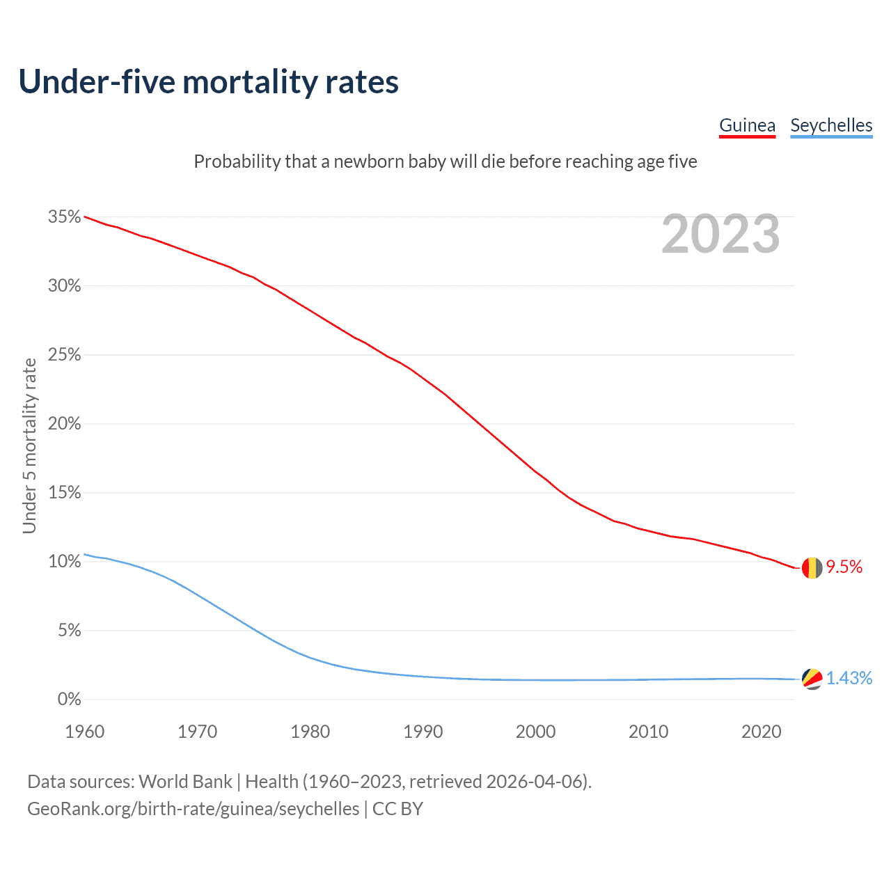 The chance that a newborn baby will die before reaching age five is 9.5% in Guinea and 1.43% in the Seychelles. Above is a chart with historical data on under-five mortality rates.