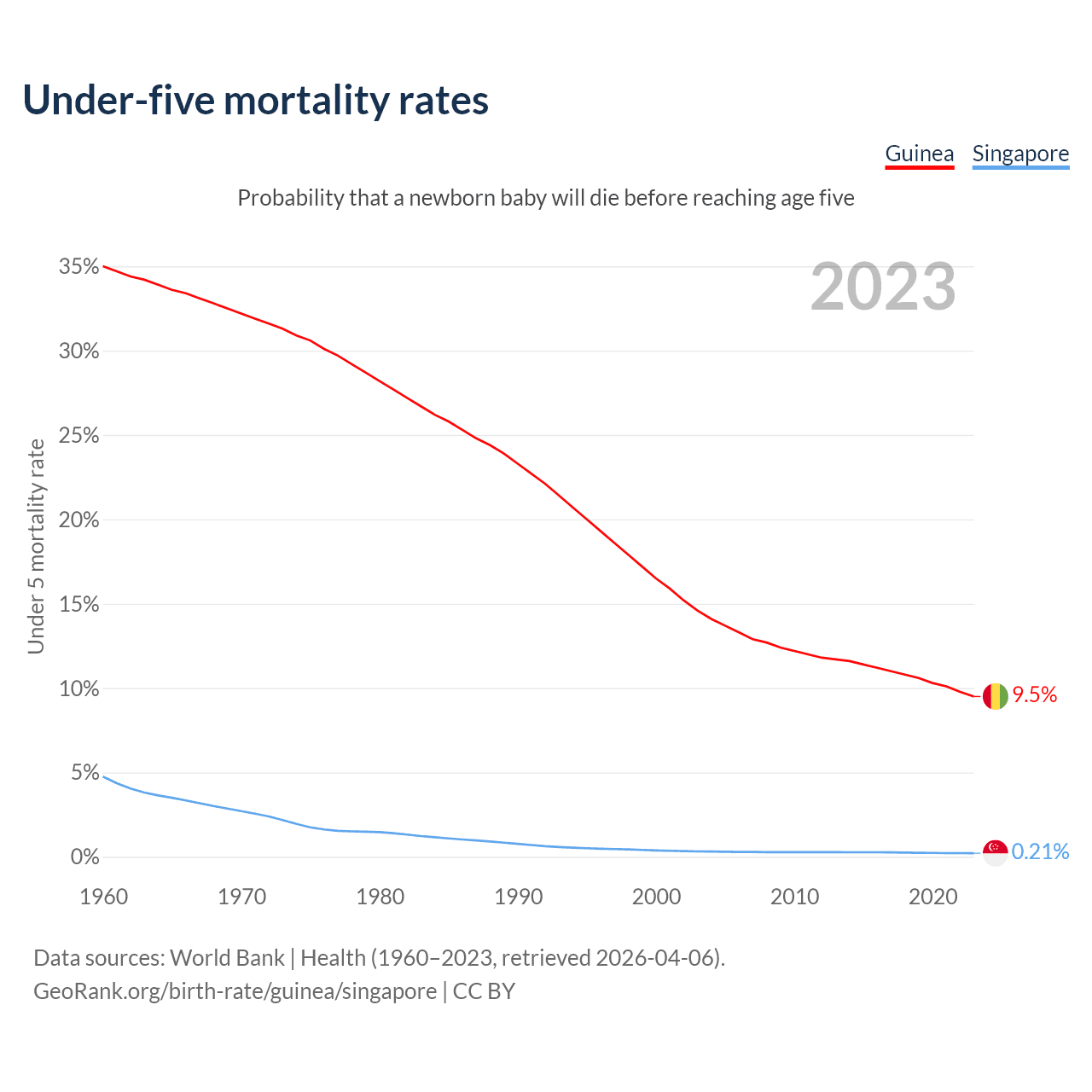 The chance that a newborn baby will die before reaching age five is 9.5% in Guinea and 0.21% in Singapore. Above is a chart with historical data on under-five mortality rates.
