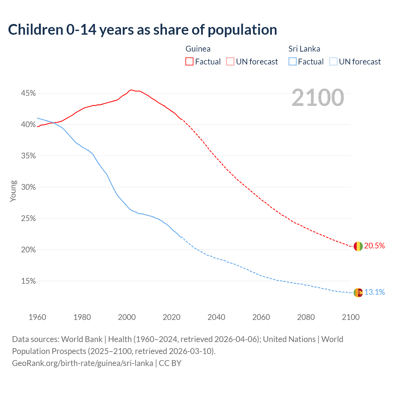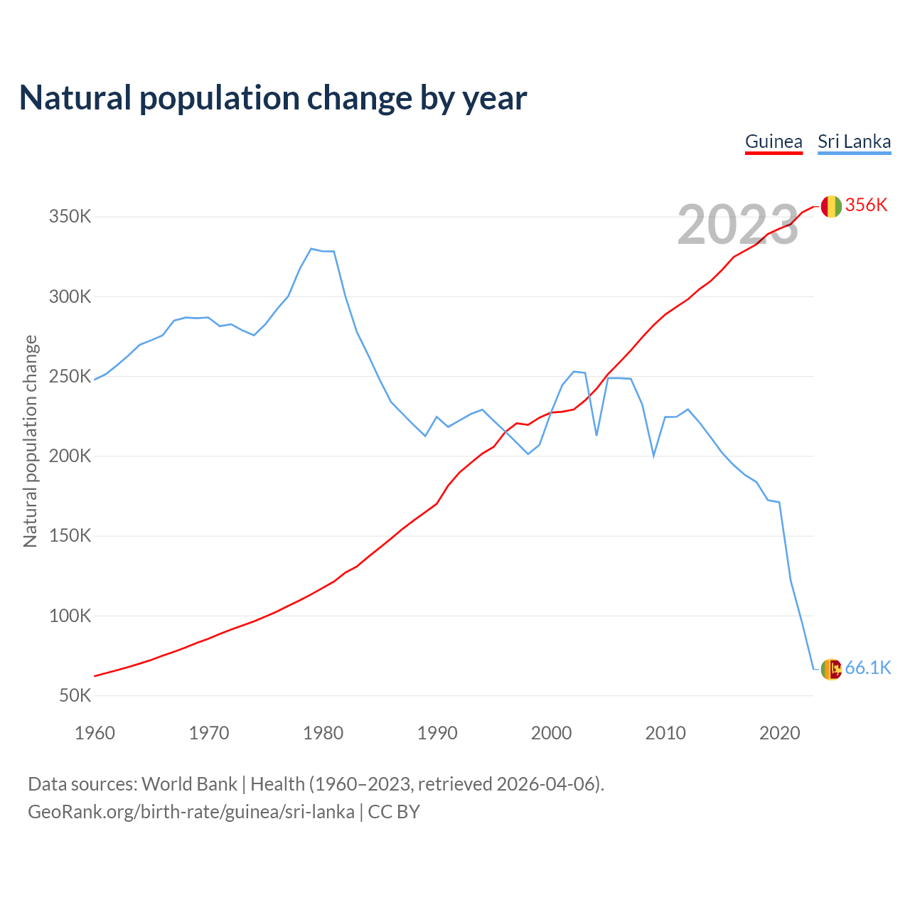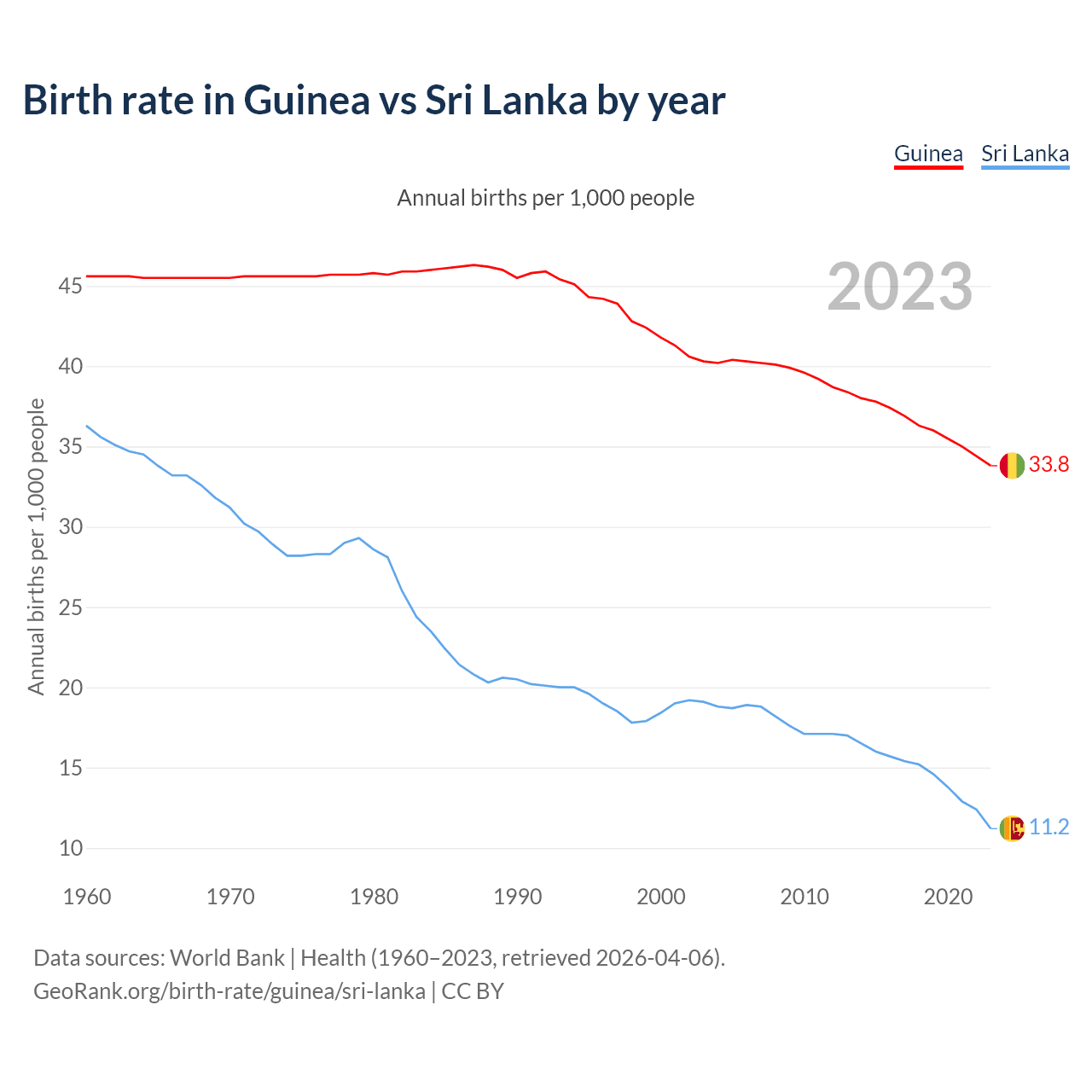 Guinea has an annual birth rate of 33.8 births per 1,000 people, compared to 11.2 for Sri Lanka. The average number of children a woman is expected to have during her lifetime — the fertility rate, is 4.22 in Guinea and 1.97 in Sri Lanka — 53.2% difference.