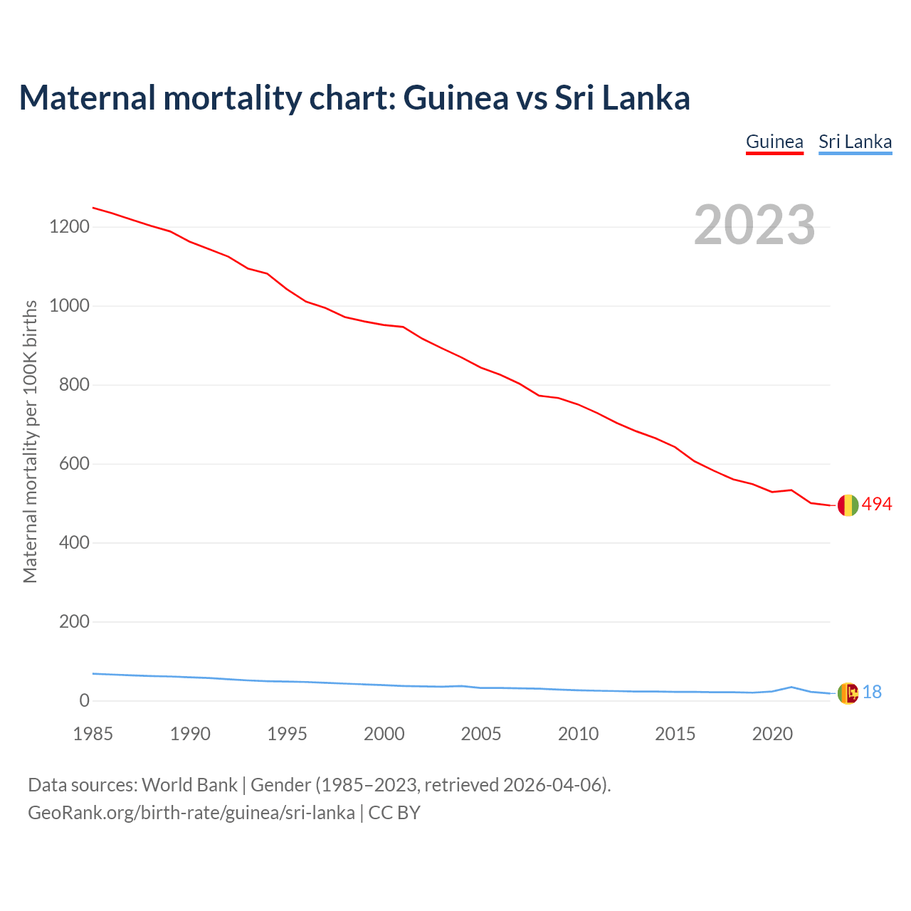 The maternal mortality rate, which is the probability of dying during childbirth or within 42 days of pregnancy termination, is 494 deaths per 100,000 live births in Guinea, compared to 18 deaths in Sri Lanka.