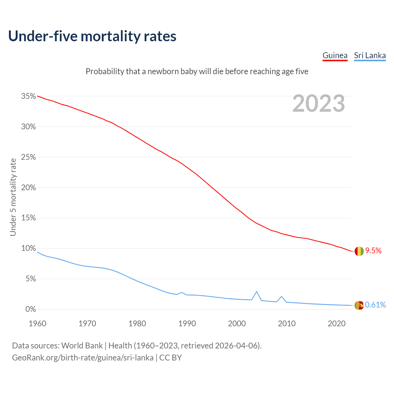 The chance that a newborn baby will die before reaching age five is 9.5% in Guinea and 0.61% in Sri Lanka. Above is a chart with historical data on under-five mortality rates.