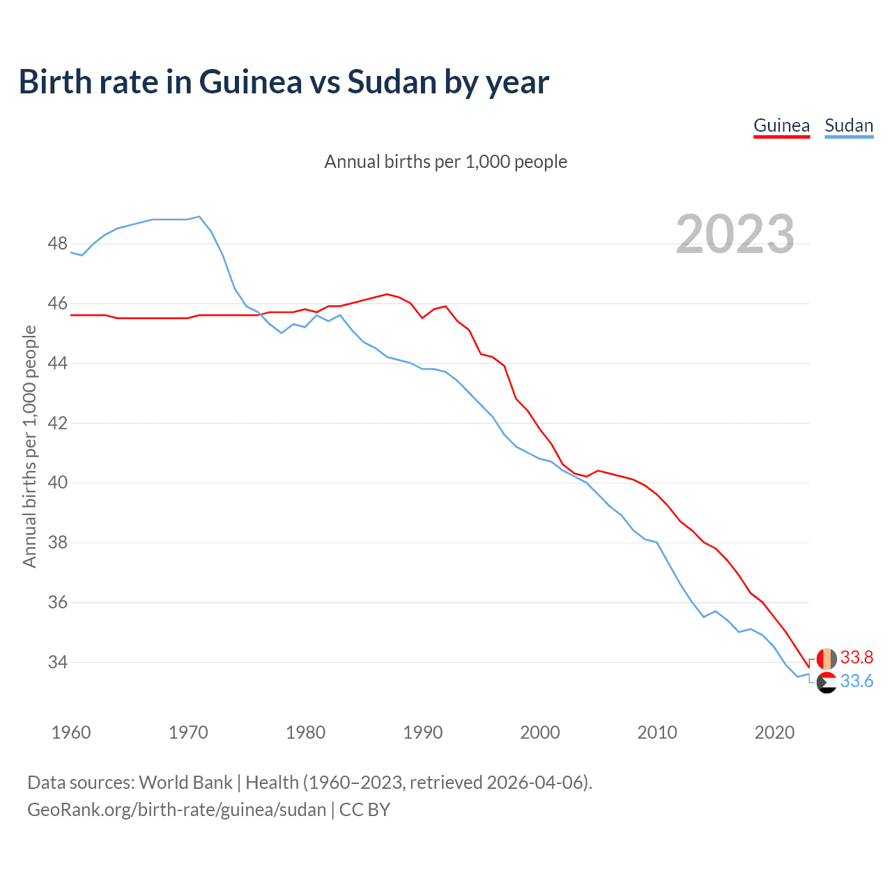 Guinea has an annual birth rate of 33.8 births per 1,000 people, compared to 33.6 for Sudan. The average number of children a woman is expected to have during her lifetime — the fertility rate, is 4.22 in Guinea and 4.32 in Sudan — 2.51% difference.