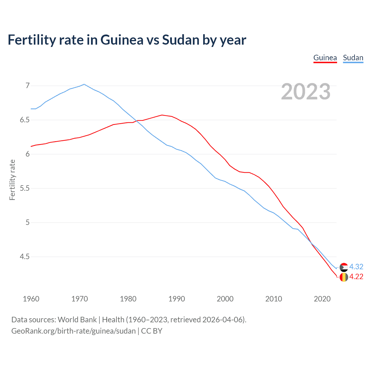 According to the latest available data on birth rates, the fertility rate in Guinea was 4.22 children per woman in 2023, compared to 4.32 in Sudan in 2023. The replacement level is considered to be 2.1 children per woman.