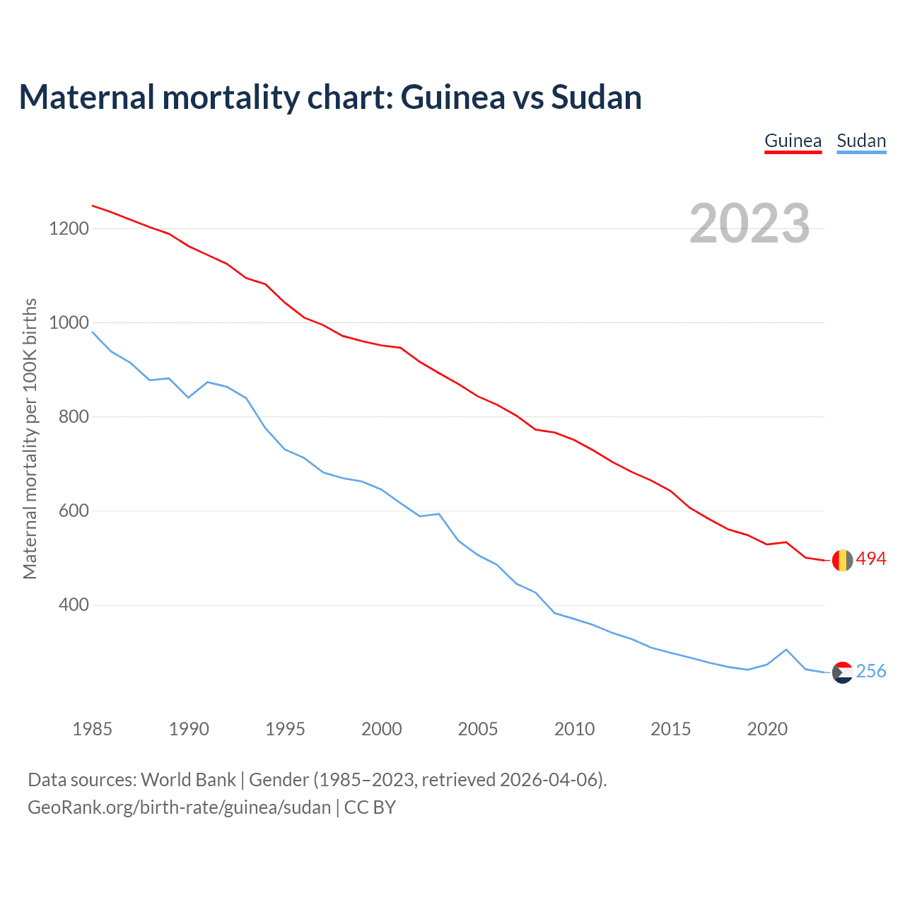 The maternal mortality rate, which is the probability of dying during childbirth or within 42 days of pregnancy termination, is 494 deaths per 100,000 live births in Guinea, compared to 256 deaths in Sudan.