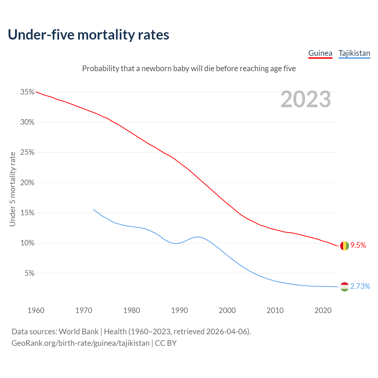 The chance that a newborn baby will die before reaching age five is 9.5% in Guinea and 2.73% in Tajikistan. Above is a chart with historical data on under-five mortality rates.