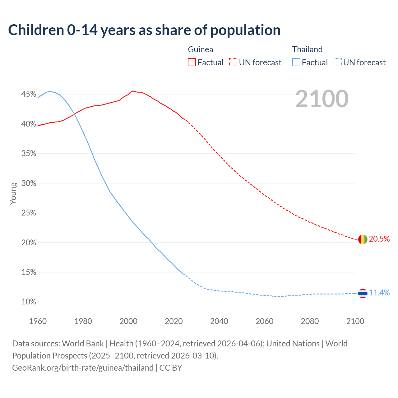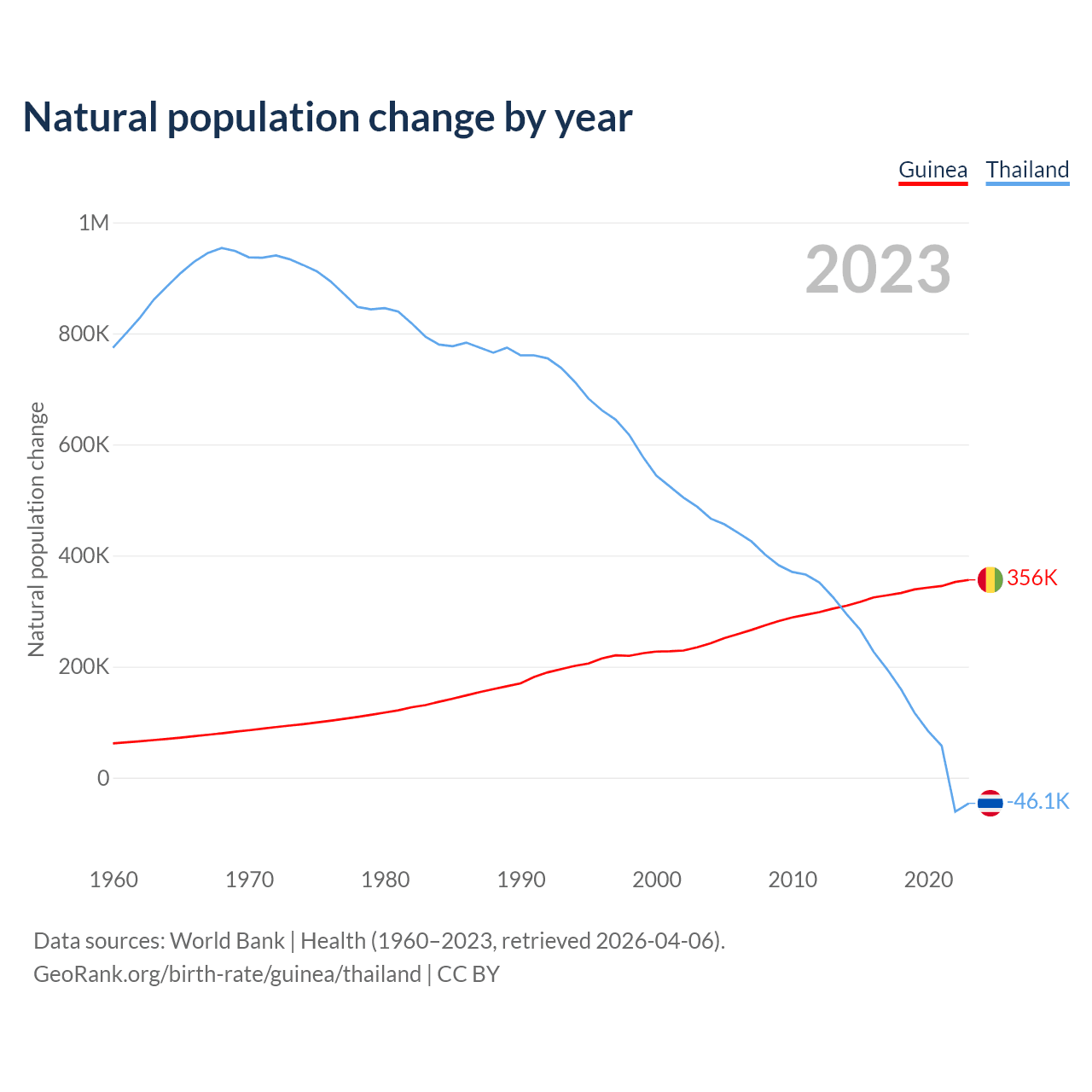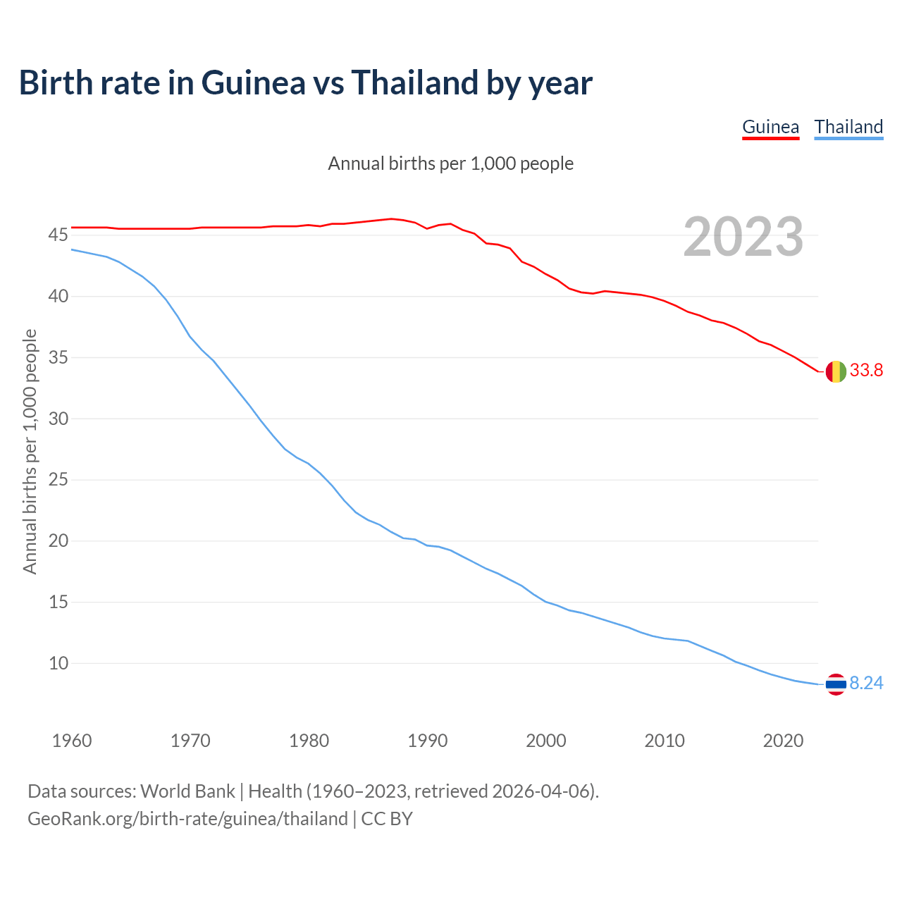 Guinea has an annual birth rate of 33.8 births per 1,000 people, compared to 8.24 for Thailand. The average number of children a woman is expected to have during her lifetime — the fertility rate, is 4.22 in Guinea and 1.21 in Thailand — 71.3% difference.