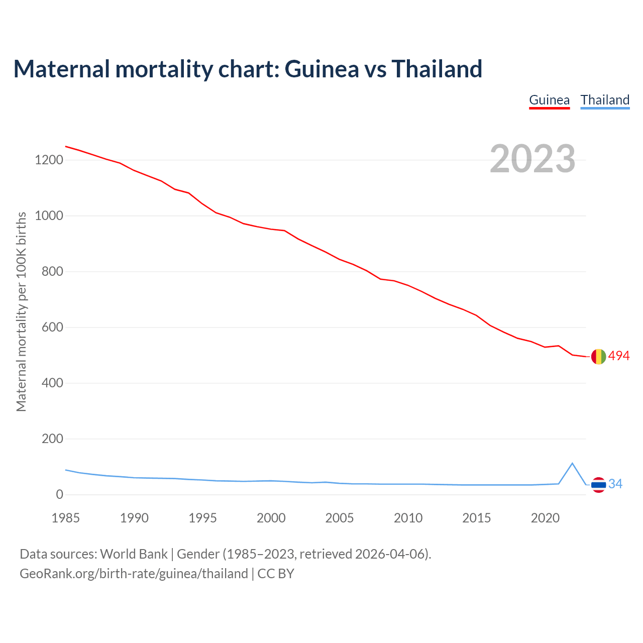 The maternal mortality rate, which is the probability of dying during childbirth or within 42 days of pregnancy termination, is 494 deaths per 100,000 live births in Guinea, compared to 34 deaths in Thailand.
