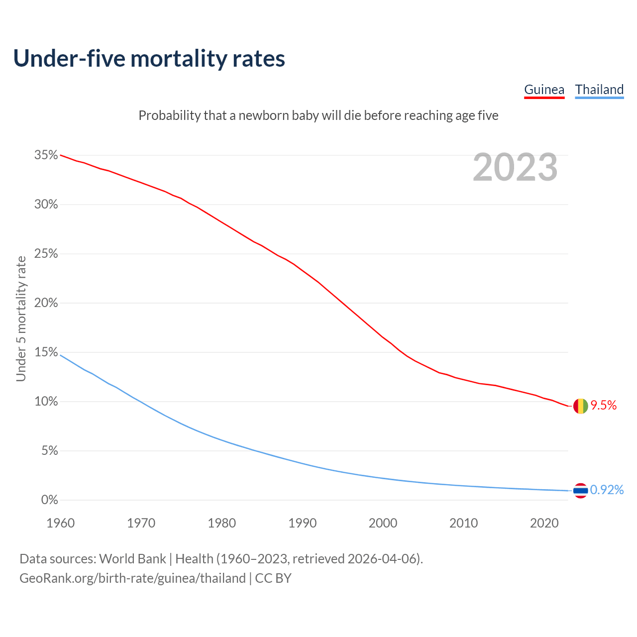 The chance that a newborn baby will die before reaching age five is 9.5% in Guinea and 0.92% in Thailand. Above is a chart with historical data on under-five mortality rates.