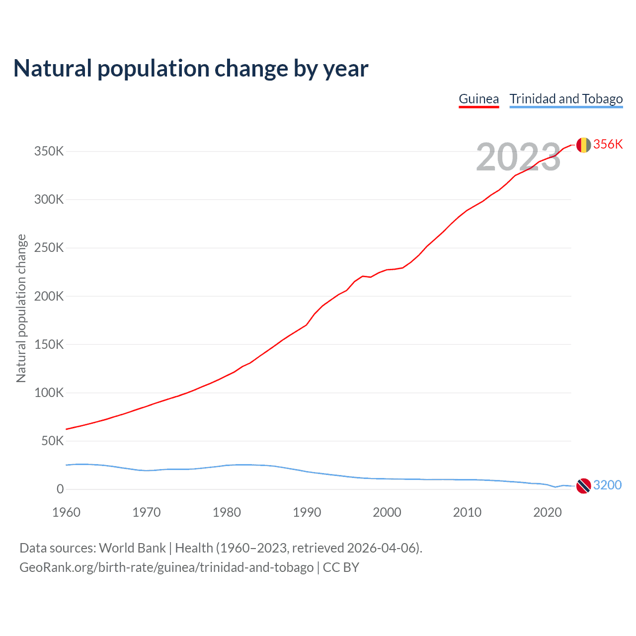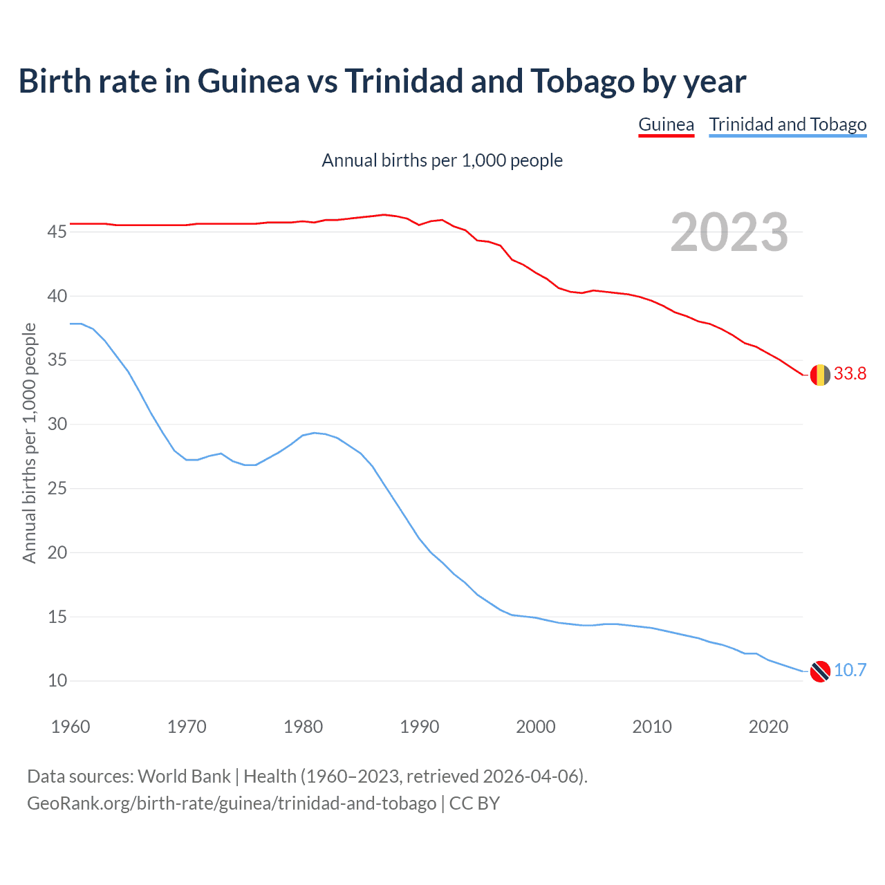Guinea has an annual birth rate of 33.8 births per 1,000 people, compared to 10.7 for Trinidad and Tobago. The average number of children a woman is expected to have during her lifetime — the fertility rate, is 4.22 in Guinea and 1.53 in Trinidad and Tobago — 63.7% difference.