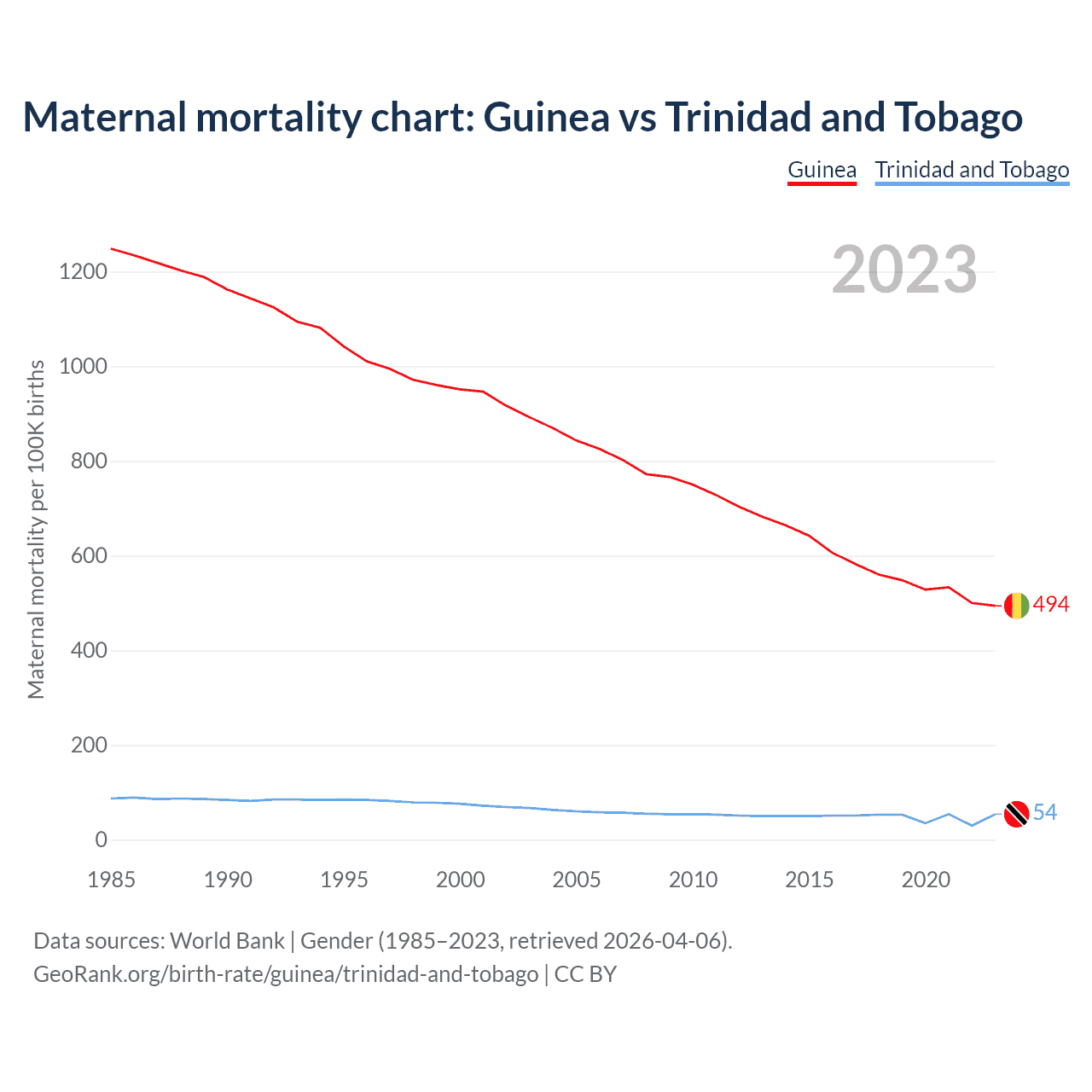 The maternal mortality rate, which is the probability of dying during childbirth or within 42 days of pregnancy termination, is 494 deaths per 100,000 live births in Guinea, compared to 54 deaths in Trinidad and Tobago.