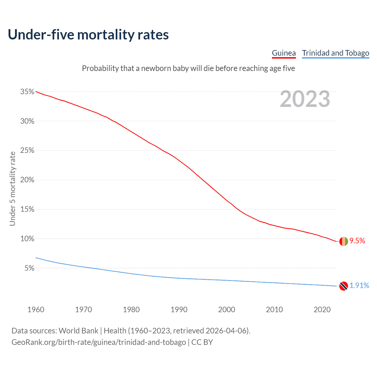 The chance that a newborn baby will die before reaching age five is 9.5% in Guinea and 1.91% in Trinidad and Tobago. Above is a chart with historical data on under-five mortality rates.