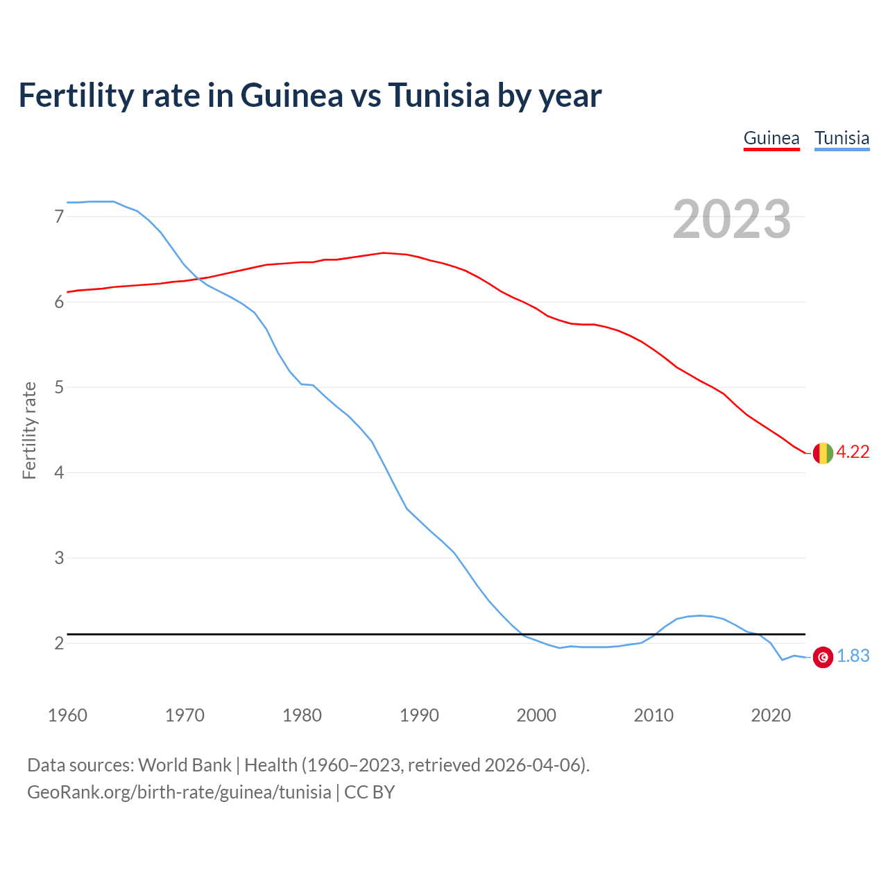 1960 vs 2023, the fertility rate has decreased by 31% in Guinea and by 74.4% in Tunisia — in 1960, it was 6.11 and 7.16, respectively.