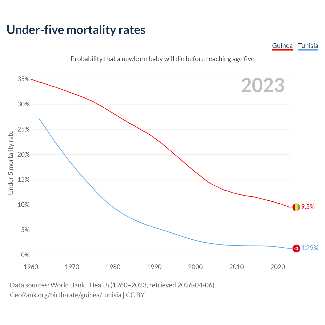 The chance that a newborn baby will die before reaching age five is 9.5% in Guinea and 1.29% in Tunisia. Above is a chart with historical data on under-five mortality rates.