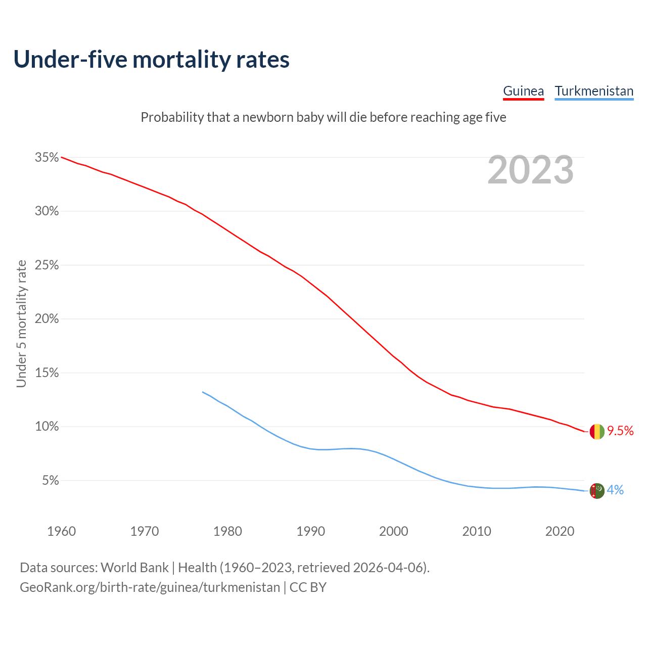 The chance that a newborn baby will die before reaching age five is 9.5% in Guinea and 4% in Turkmenistan. Above is a chart with historical data on under-five mortality rates.