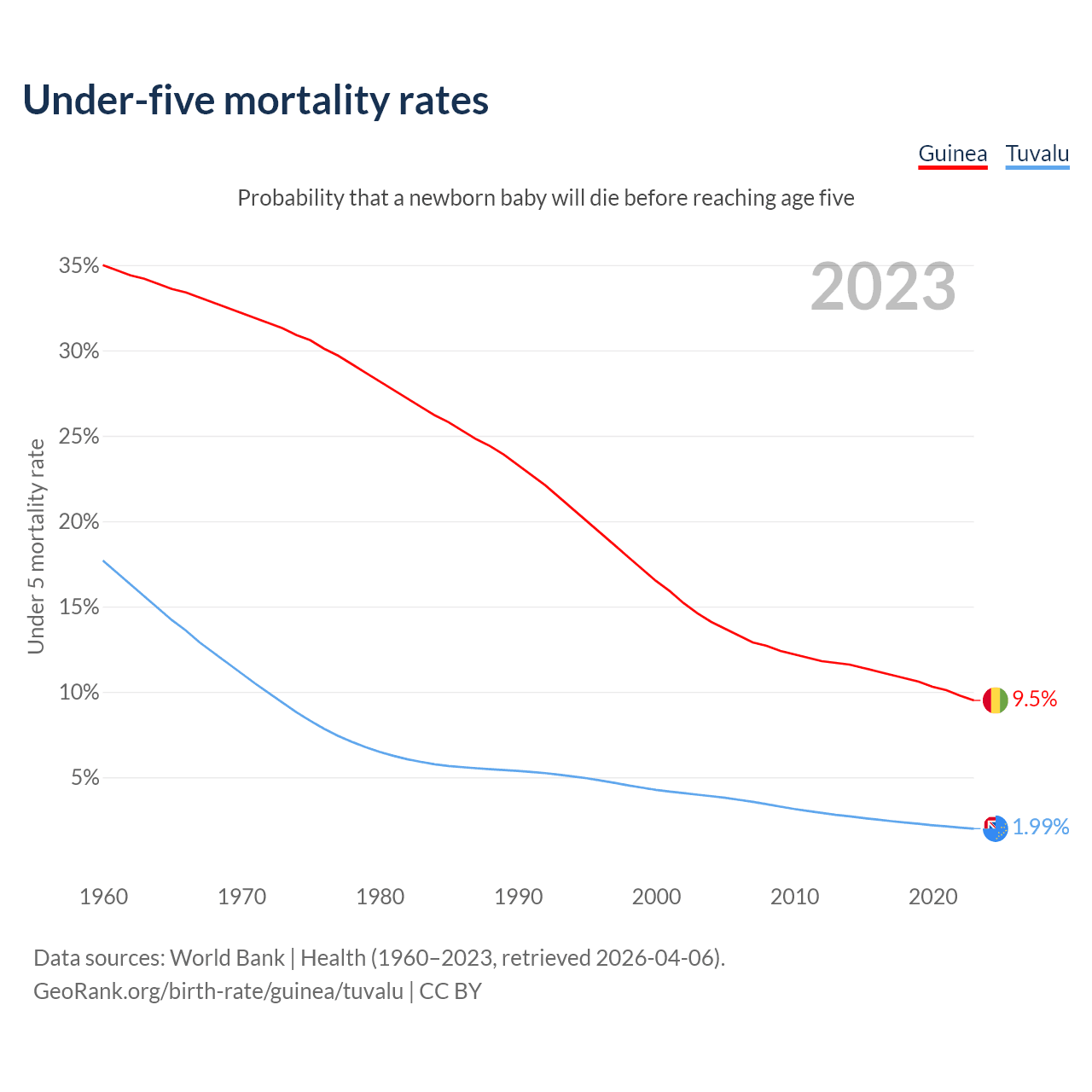 The chance that a newborn baby will die before reaching age five is 9.5% in Guinea and 1.99% in Tuvalu. Above is a chart with historical data on under-five mortality rates.