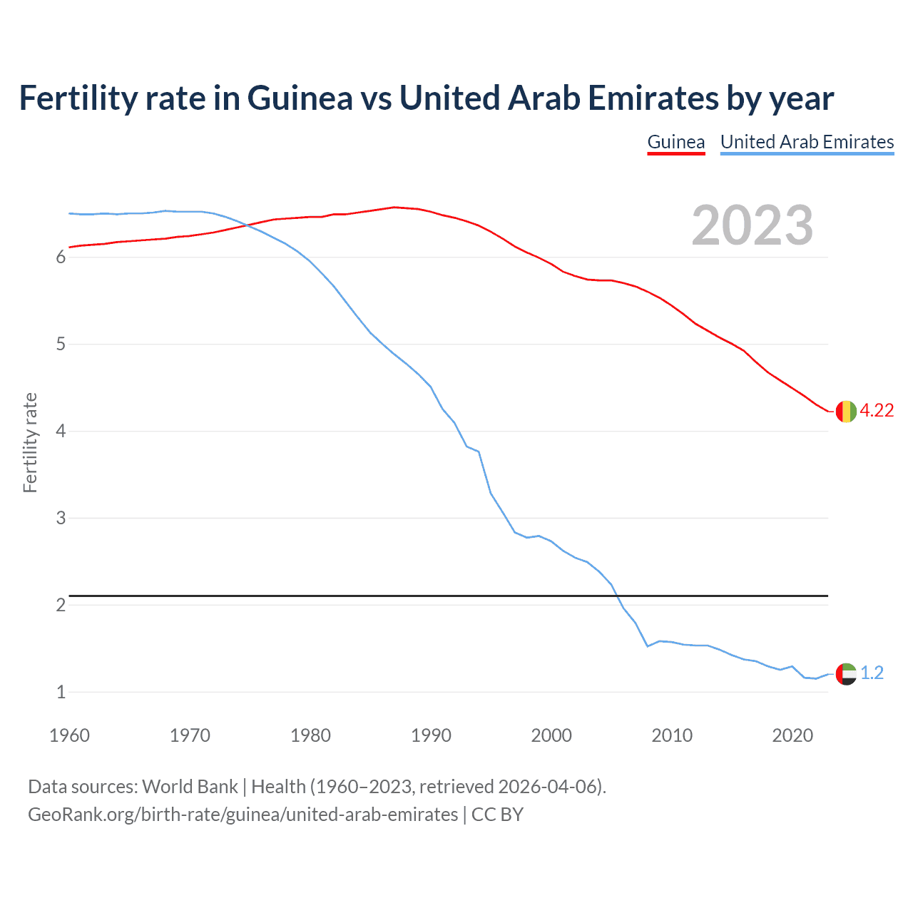 According to the latest available data on birth rates, the fertility rate in Guinea was 4.22 children per woman in 2023, compared to 1.2 in the United Arab Emirates in 2023. The replacement level is considered to be 2.1 children per woman.