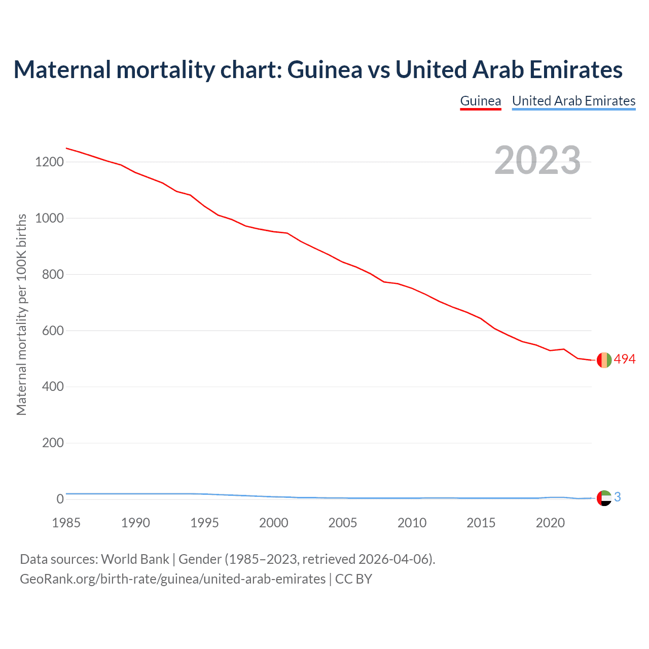 The maternal mortality rate, which is the probability of dying during childbirth or within 42 days of pregnancy termination, is 494 deaths per 100,000 live births in Guinea, compared to 3 deaths in the United Arab Emirates.
